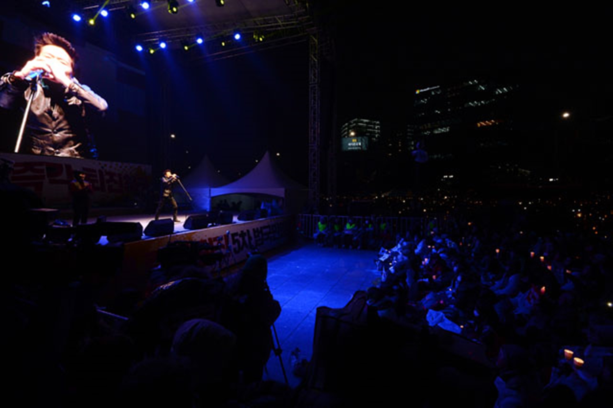 [더팩트ㅣ남용희 인턴기자] 박근혜 대통령의 퇴진을 요구하는 5차 촛불집회가 26일 오후 서울 광화문 광장에서 열린 가운데 가수 안치환이 광야에서를 부르고 있다. 20161126 사진공동취재단