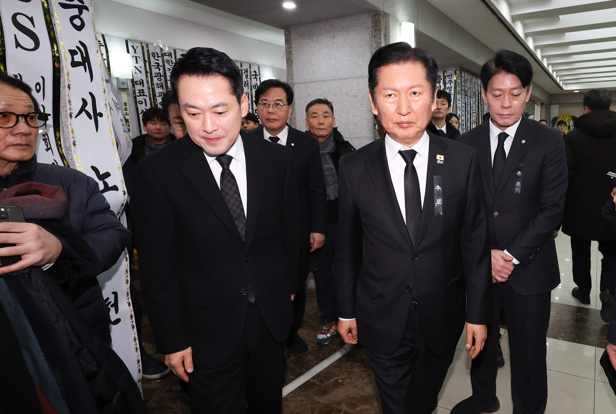 정청래 더불어민주당 대표가 30일 서울 종로구 서울대학교병원 장례식장에 마련된 고 이해찬 전 국무총리의 빈소에서 조문을 마친 장동혁 국민의힘 대표를 배웅하고 있다. 2026.1.30.