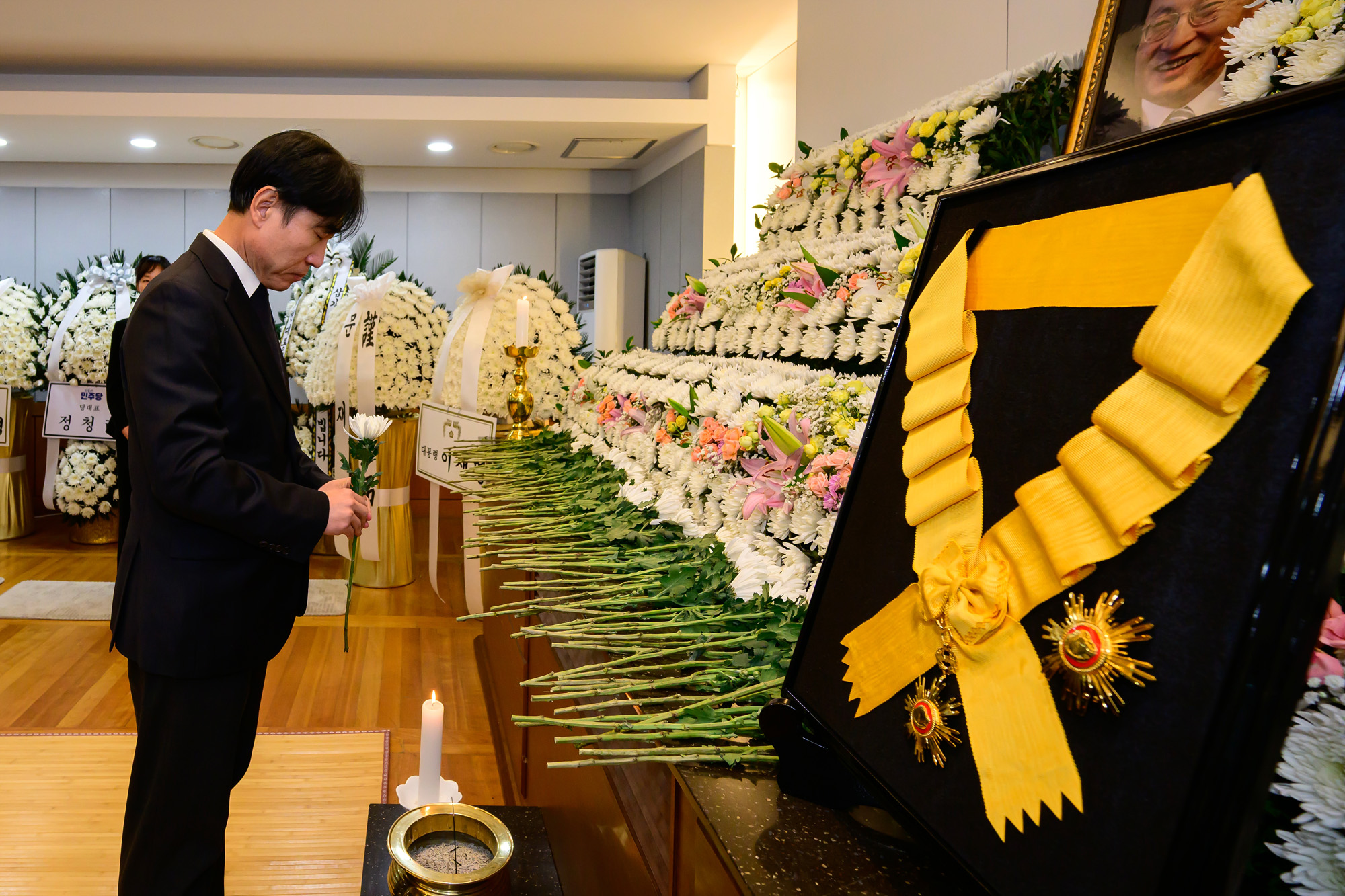 30일 오후 서울 종로구 서울대학교병원 장례식장에 마련된 고 이해찬 전 국무총리의 빈소에서 하태경 보험연수원장이 조문을 하고 있다. 2026.01.30 사진공동취재단