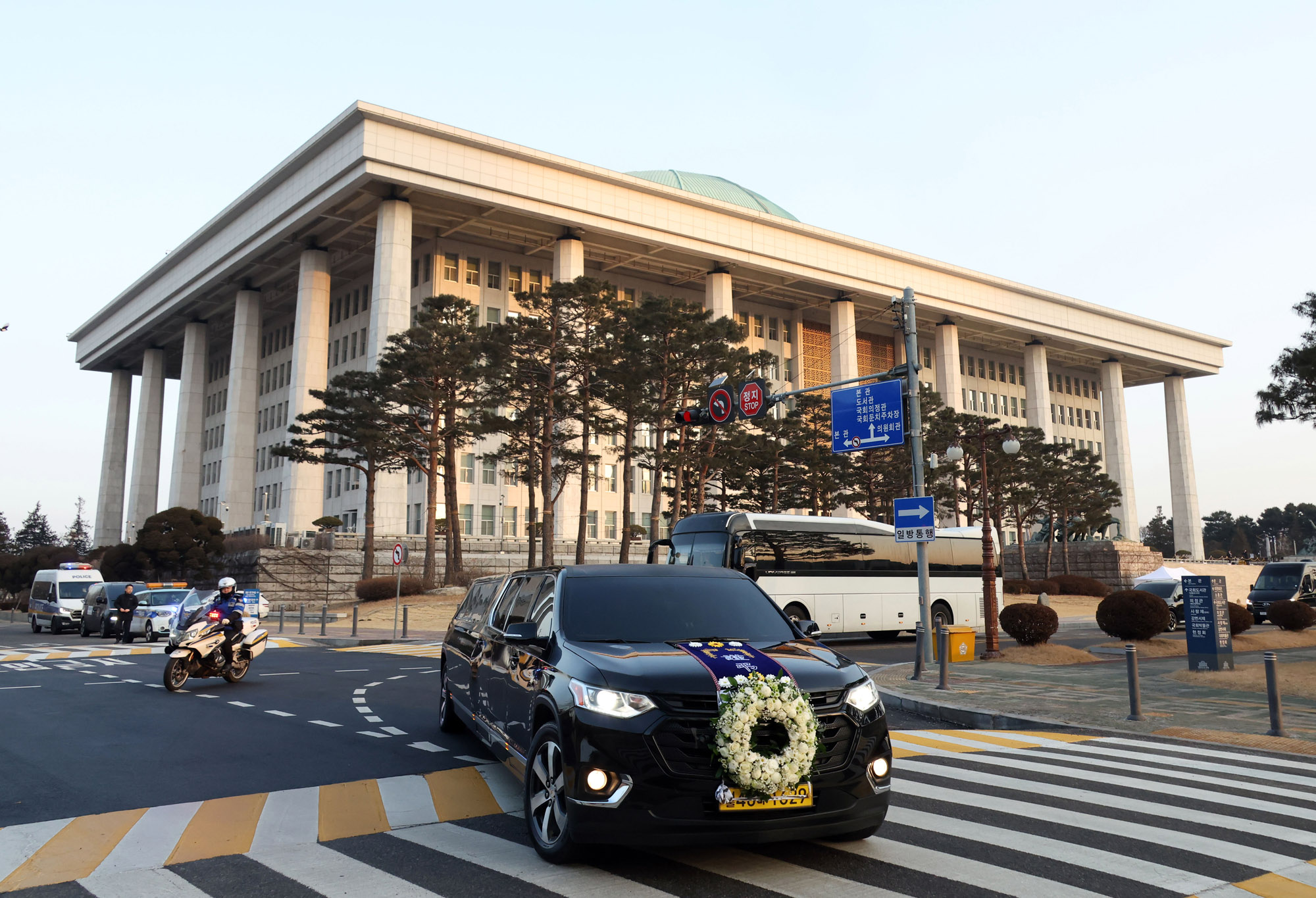 31일 고 이해찬 전 국무총리의 운구차량이 국회 본청을 지나 의원회관으로 향하고 있다.