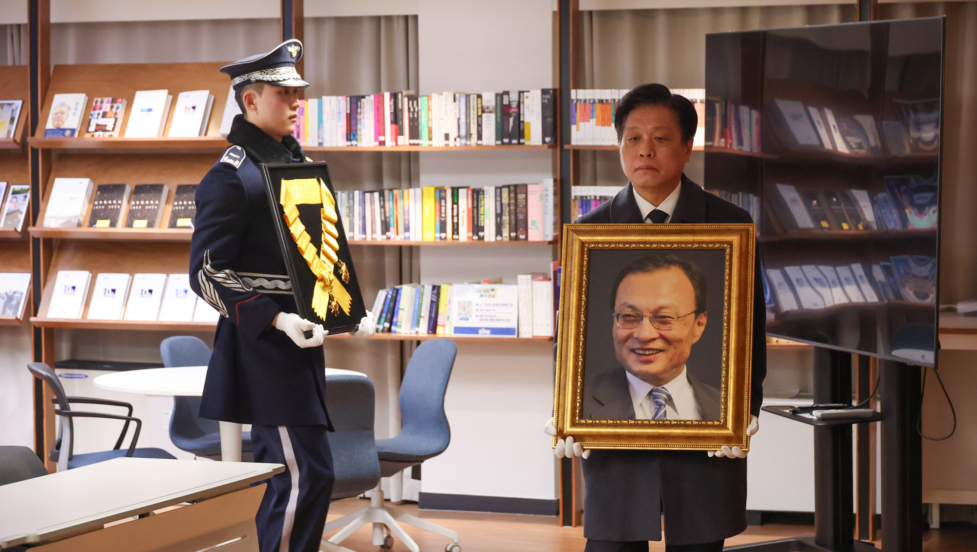 고 이해찬 전 총리의 영정이 31일 서울 영등포구 더불어민주당 당원존에 들어서고 있다. 2026.1.31