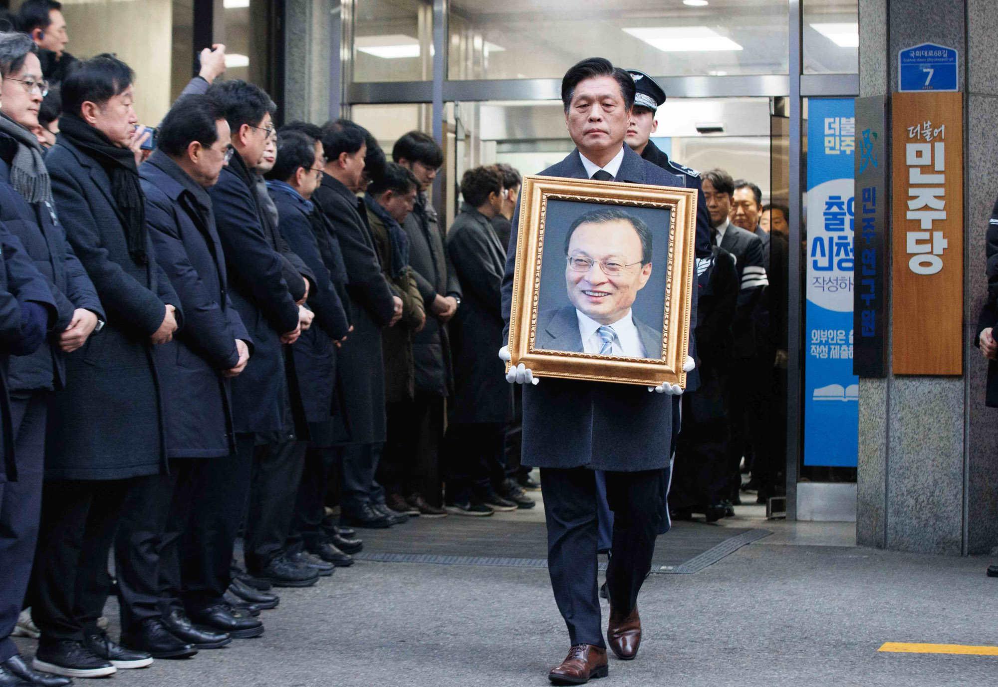 31일 오전 서울 여의도 더불어민주당 중앙당사에서 엄수된 고(故) 이해찬 민주평화통일자문회의 수석부의장 노제에서 조승래 더불어민주당 사무총장이 영정을 들고 당사에서 나오고 있다.