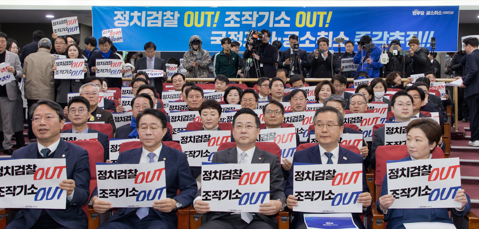 [Eoimage=서울] 이종현 기자 = 23일 서울 여의도 국회 의원회관에서 열린 더불어민주당 이재명 대통령 사건 공소취소와 국정조사 추진을 위한 의원모임 출범식·결의대회에 60여명의 의원들이 참석해 손팻말을 들고 있다. 2026.2.23 eomaster@eoimage.com