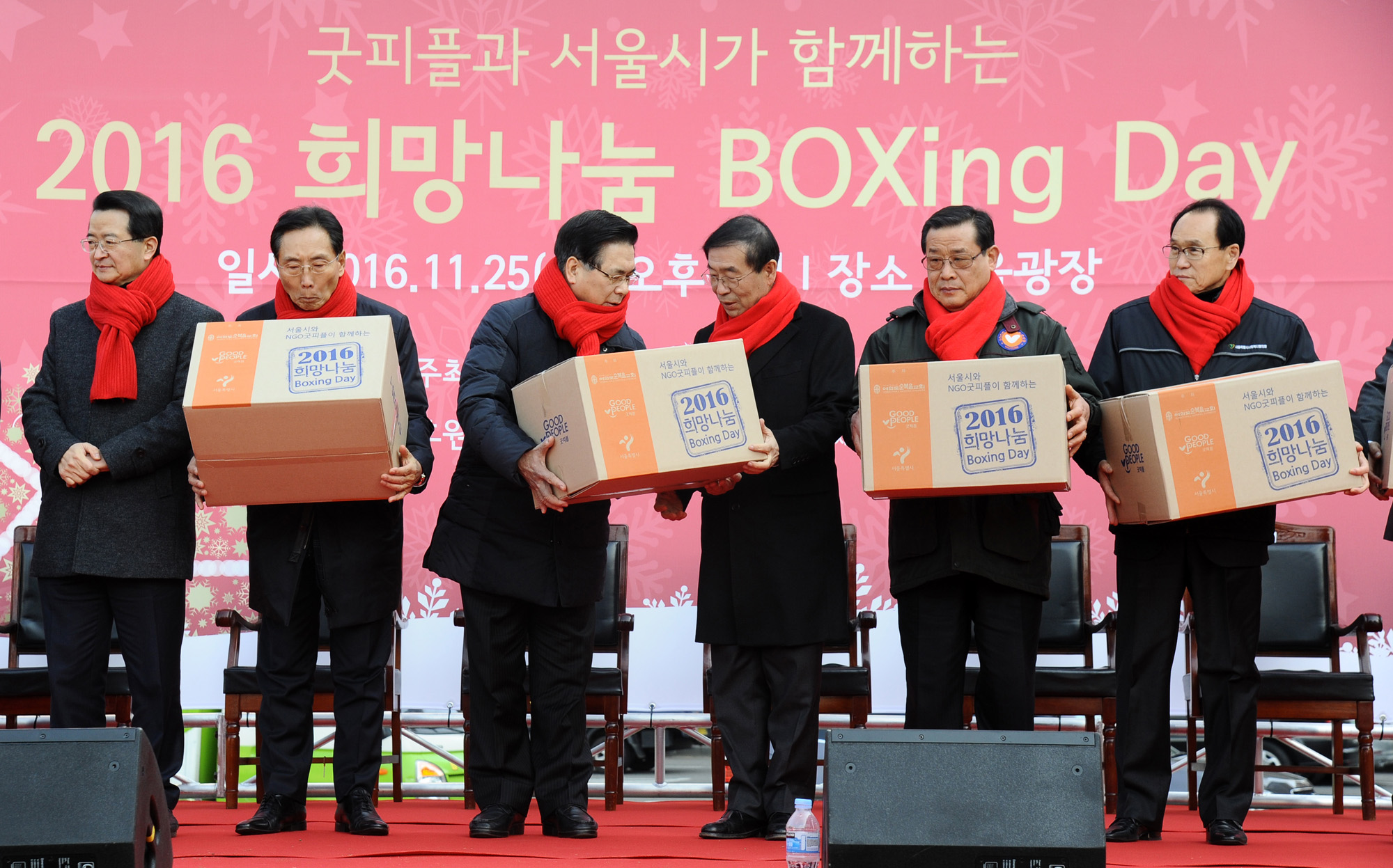 박원순 서울시장(왼쪽)과 이영훈 굿피플 이사장(오른쪽)이 25일 오후 시청 앞 서울광장에서 열린 '2016 희망나눔 박싱데이' 행사에서 참가자들과 함께 희망나눔 상자를 만들고 있다. 서울시 제공