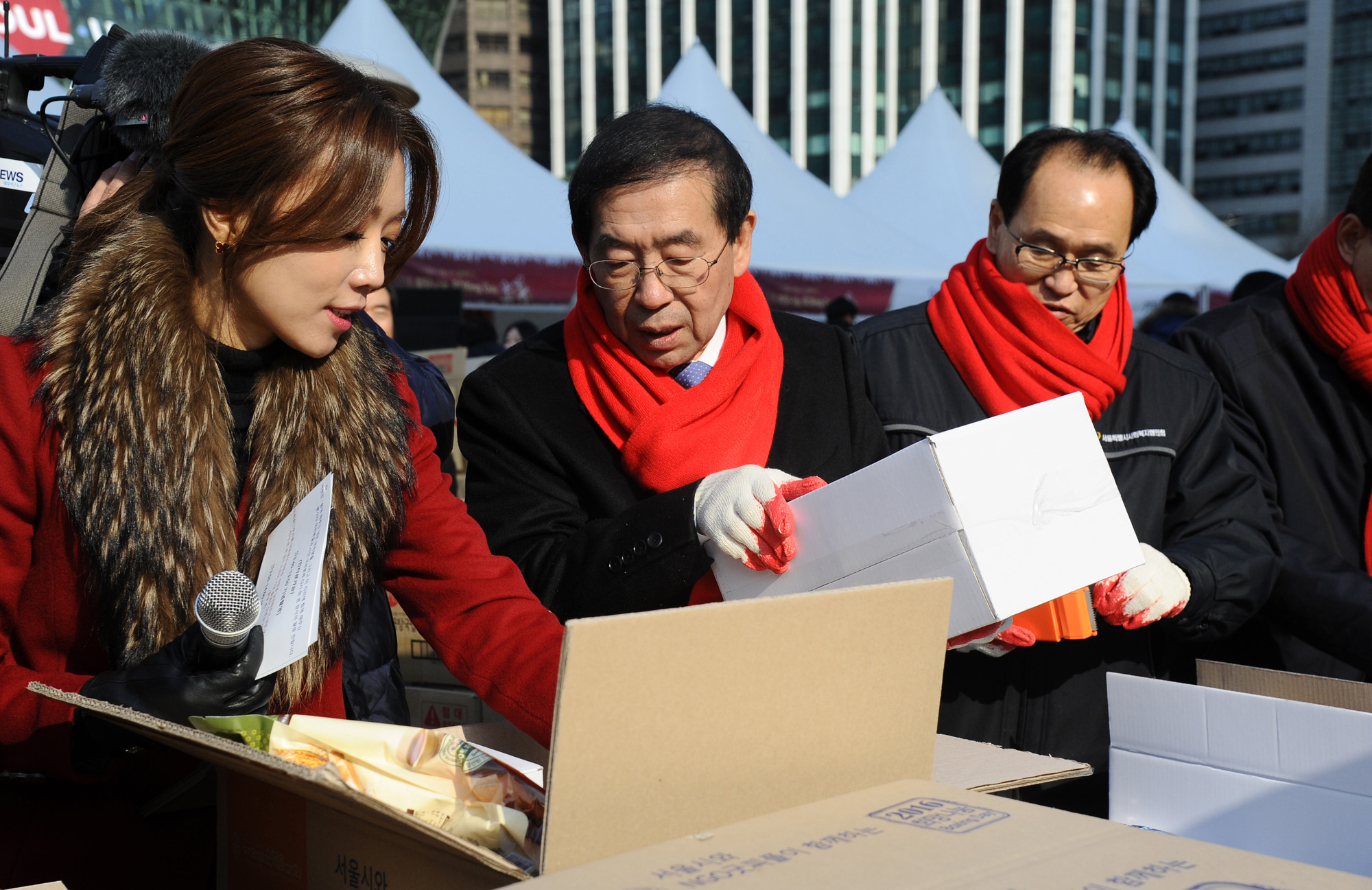 박원순 서울시장(왼쪽)과 이영훈 굿피플 이사장(오른쪽)이 25일 오후 시청 앞 서울광장에서 열린 '2016 희망나눔 박싱데이' 행사에서 참가자들과 함께 희망나눔 상자를 만들고 있다. 서울시 제공