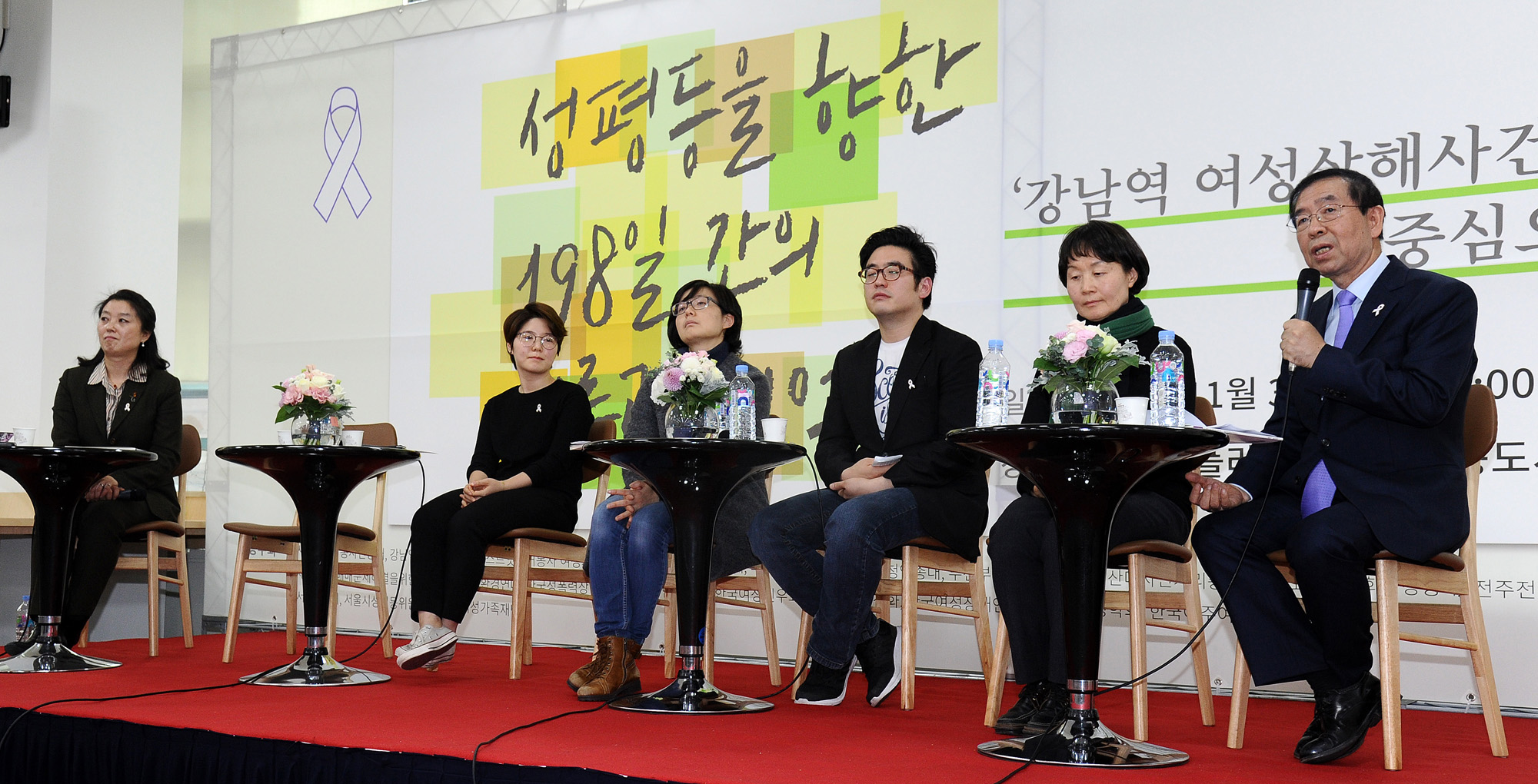 30일 오후 서울 동작구 서울여성프라자에서 열린 '성평등을 향한 198일 간의 기록과 기억' 행사에서 박원순 서울시장과 참석자들이 여성폭력 근절 캠페인에 참여하고 있다. 서울시 제공
