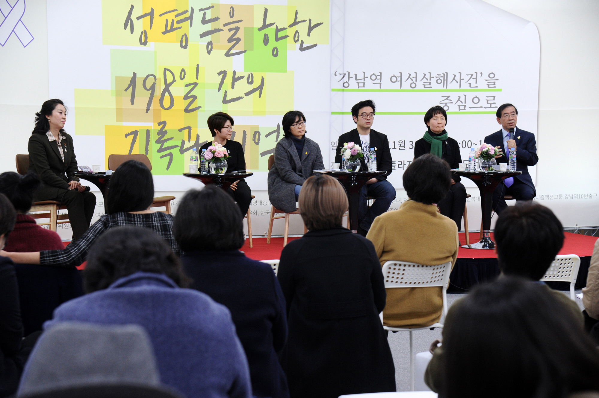 30일 오후 서울 동작구 서울여성프라자에서 열린 '성평등을 향한 198일 간의 기록과 기억' 행사에서 박원순 서울시장과 참석자들이 여성폭력 근절 캠페인에 참여하고 있다. 서울시 제공