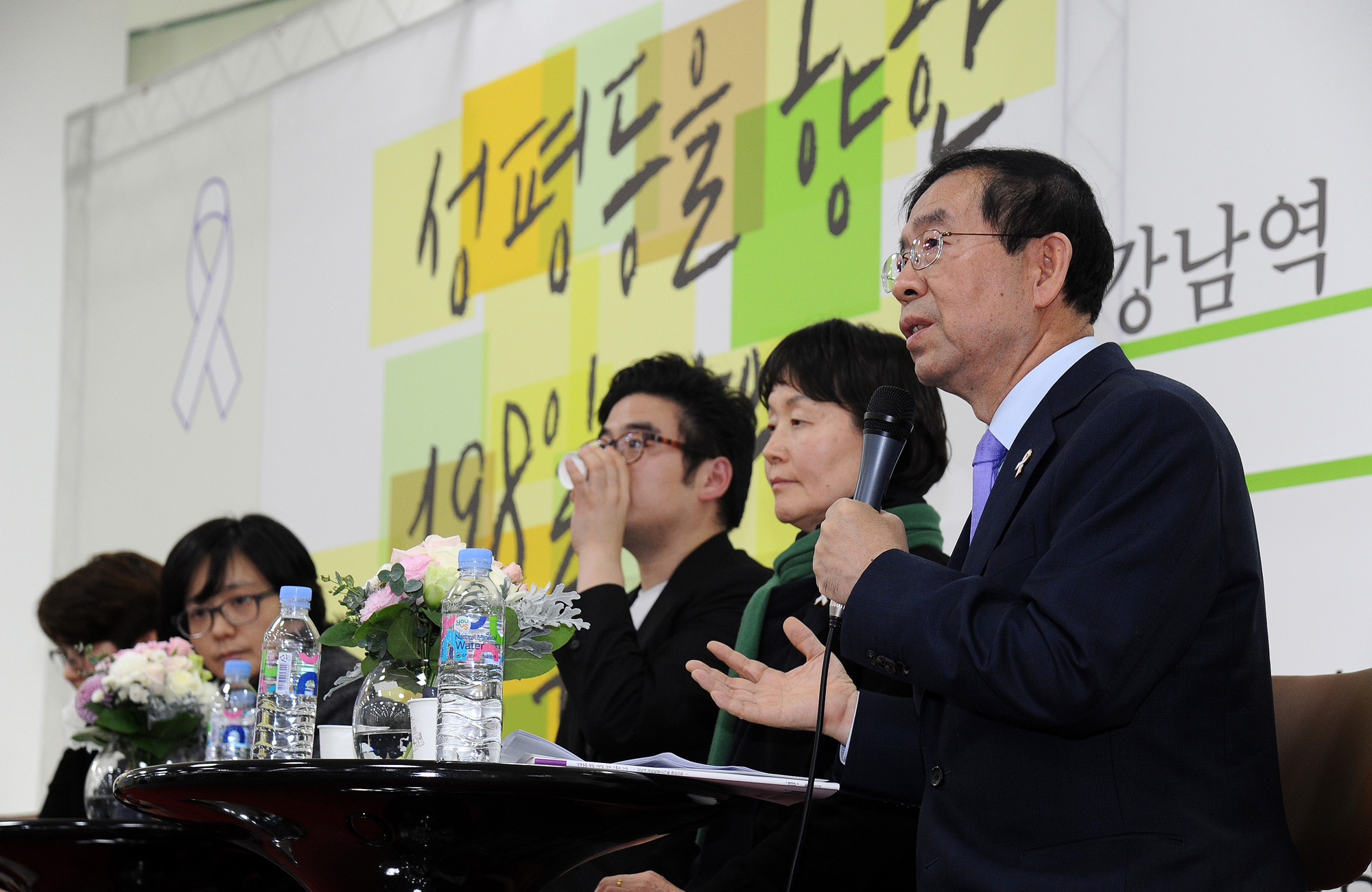 30일 오후 서울 동작구 서울여성프라자에서 열린 '성평등을 향한 198일 간의 기록과 기억' 행사에서 박원순 서울시장과 참석자들이 여성폭력 근절 캠페인에 참여하고 있다. 서울시 제공