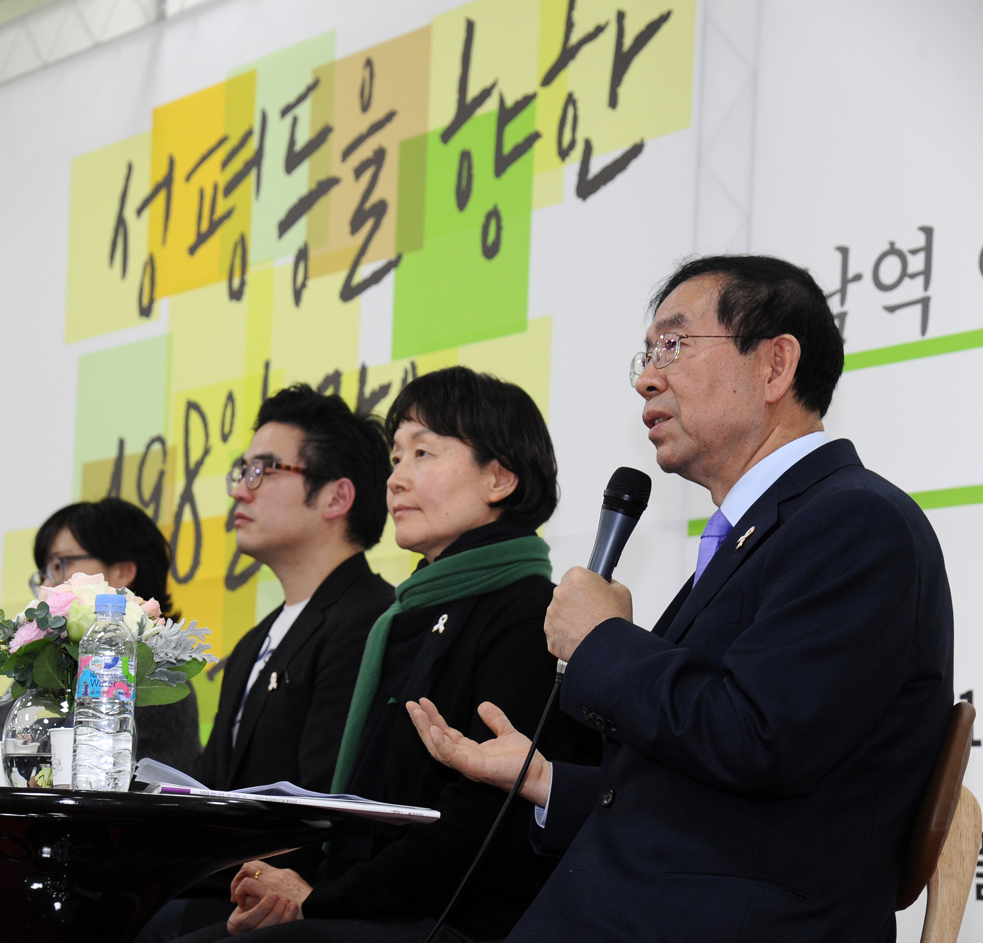 30일 오후 서울 동작구 서울여성프라자에서 열린 '성평등을 향한 198일 간의 기록과 기억' 행사에서 박원순 서울시장과 참석자들이 여성폭력 근절 캠페인에 참여하고 있다. 서울시 제공