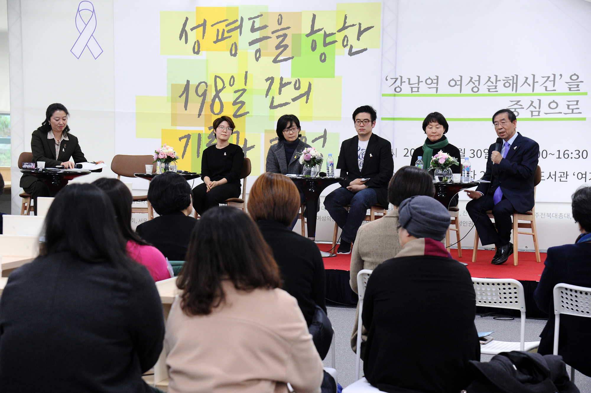 30일 오후 서울 동작구 서울여성프라자에서 열린 '성평등을 향한 198일 간의 기록과 기억' 행사에서 박원순 서울시장과 참석자들이 여성폭력 근절 캠페인에 참여하고 있다. 서울시 제공