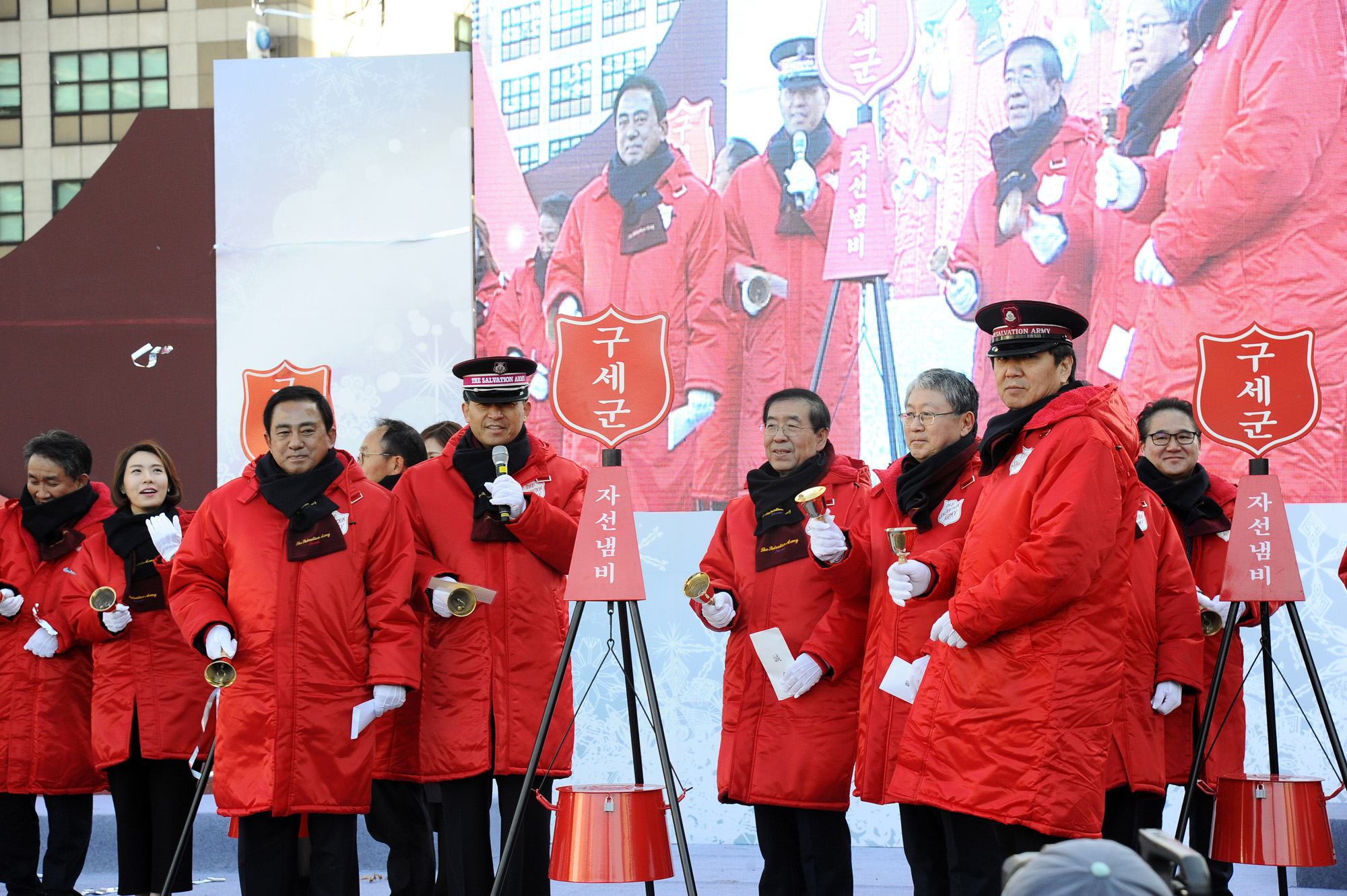 박원순 서울시장이 1일 오전 서울 시청광장에서 열린 '구세군 2016 자선냄비시종식' 행사에 참석해 자선냄비에 헌금하고 있다. 서울시 제공