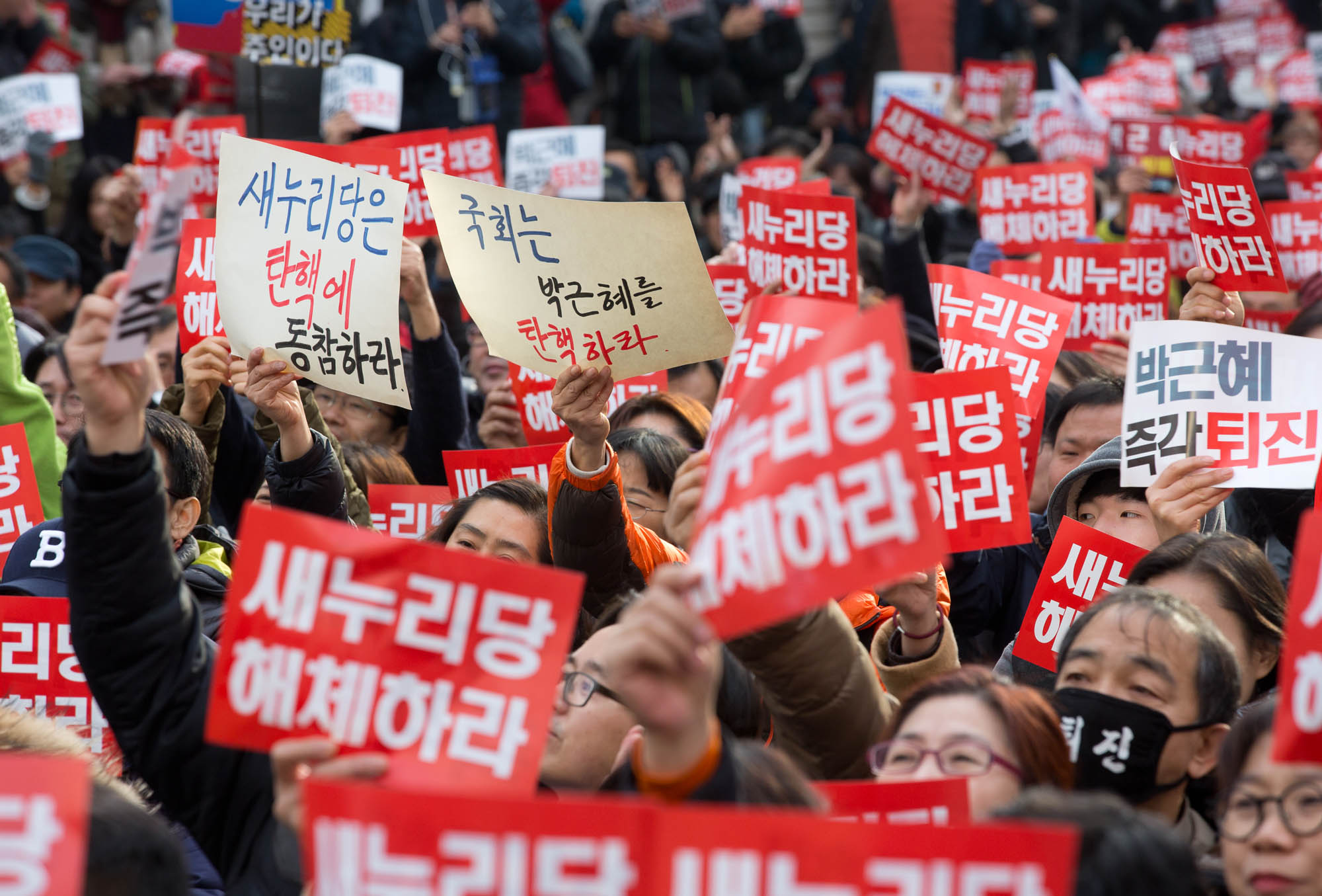 [서울=eoimage] 임준선기자 = 박근혜정권퇴진비상국민행동은 3일 서울 여의도 새누리당사 앞에서 ‘박근혜 퇴진! 새누리당 해체! 국정농단 공범 새누리당 규탄 시민대회’를 열었다.