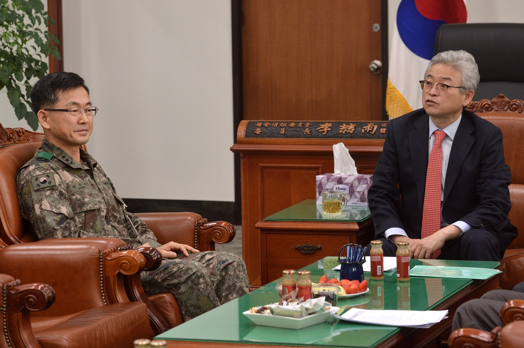 국군 사이버 사령부의 백신 중계 서버가 북한 군으로 추정되는 외부 세력에 뚫려 논란이 일고 있는 가운데 7일 오후 국회 정보위에서 열린 국군사이버사령부와의 간담회에서 이철우 정보위원장이(오른쪽) 변재선 국군사이버사령관의 설명을 듣고 있다. 2016.12.07 시사IN 이명익 |