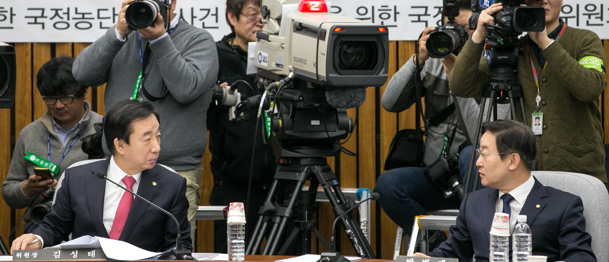 (서울=포커스뉴스) 김성태 최순실게이트 국조특위 위원장이 7일 오전 서울 여의도 국회에서 열린 '박근혜 정부의 최순실 등 민간인에 의한 국정농단 의혹사건 진실규명을 위한 국정조사특위 제2차 청문회'에 참석해 박범계 더불어민주당 의원과 의견을 나누고 있다. 161207 사진공동취재단 |