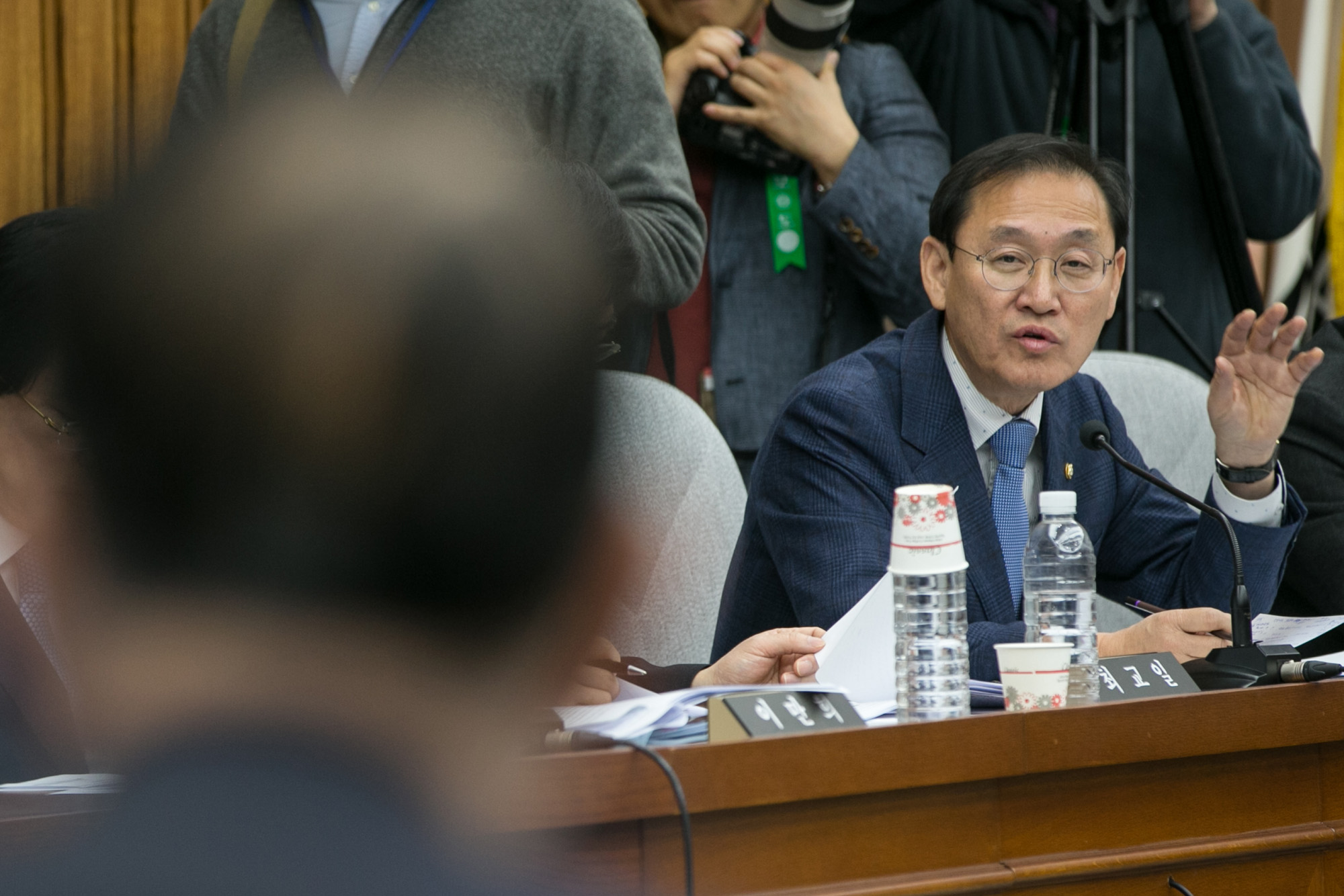 (서울=포커스뉴스) 정유섭 새누리당 의원이 7일 오전 서울 여의도 국회에서 열린 '박근혜 정부의 최순실 등 민간인에 의한 국정농단 의혹사건 진실규명을 위한 국정조사특위 제2차 청문회'에 참석해 김기춘 전 대통령비서실장에게 질의하고 있다. 161207 사진공동취재단 |