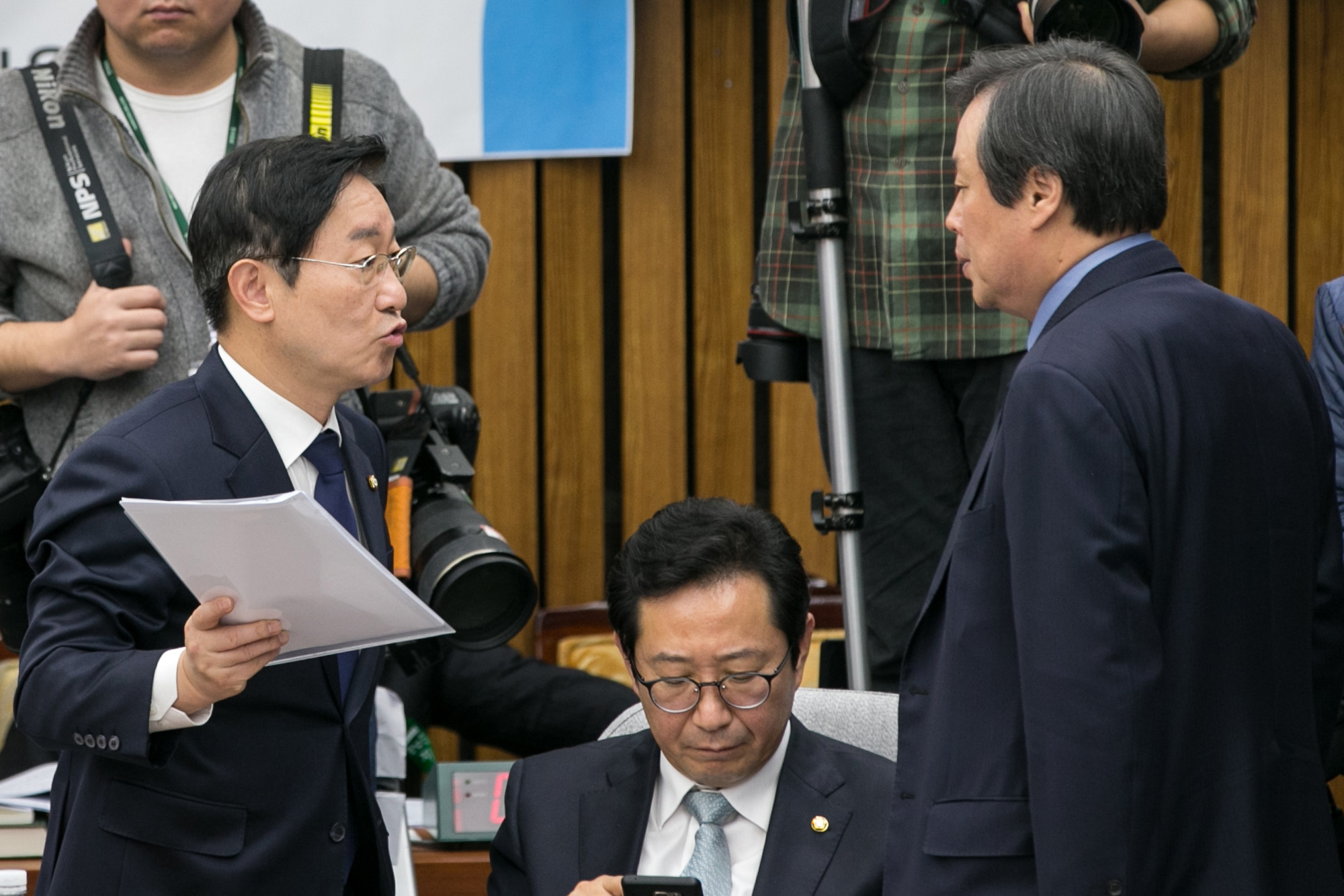 (서울=포커스뉴스) 박범계 더불어민주당 의원과 도종환 의원이 7일 오전 서울 여의도 국회에서 열린 '박근혜 정부의 최순실 등 민간인에 의한 국정농단 의혹사건 진실규명을 위한 국정조사특위 제2차 청문회'에 참석해 의견을 나누고 있다. 161207 사진공동취재단 |