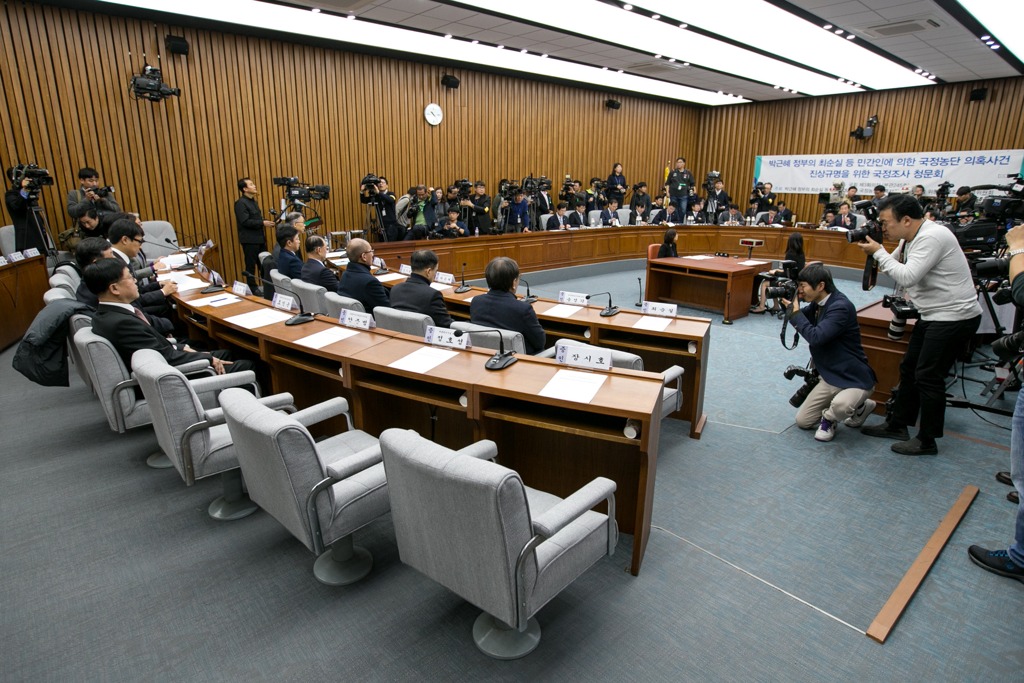 (서울=포커스뉴스) 7일 오전 서울 여의도 국회에서 열린 '박근혜 정부의 최순실 등 민간인에 의한 국정농단 의혹사건 진실규명을 위한 국정조사특위 제2차 청문회'에 최순실, 장시호, 정호성 전 청와대 부속비서관, 안종범 전 청와대 경제수석 등이 불출석해 자리가 비어 있다. 161207 사진공동취재단 |