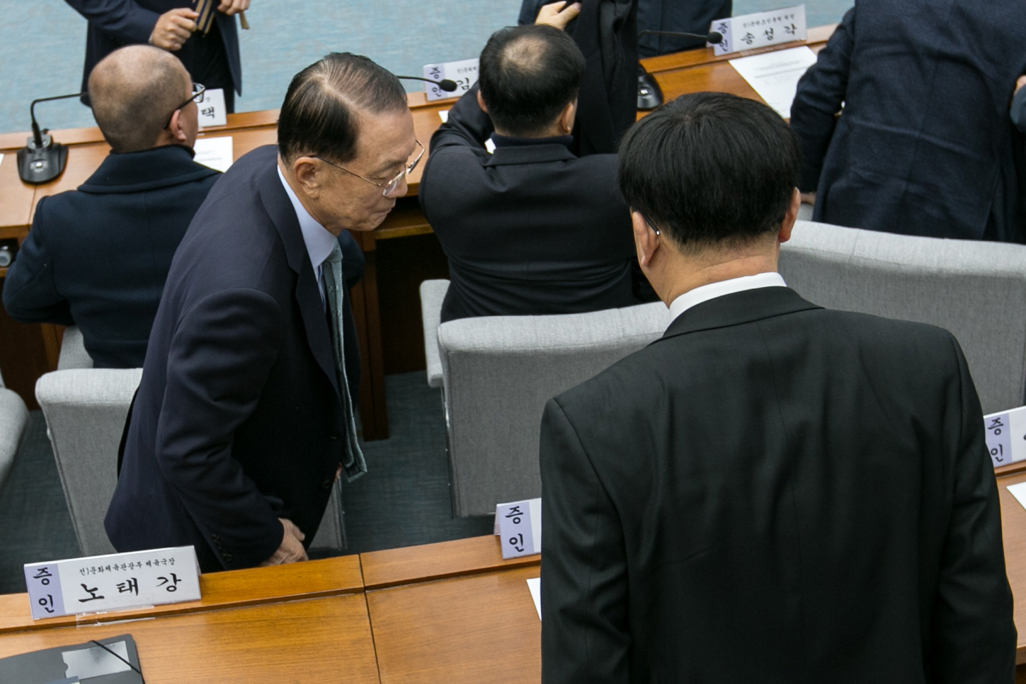 (서울=포커스뉴스) 김기춘 전 대통령비서실장과 조인근 대통령비서실연설기록비서관이 7일 오전 서울 여의도 국회에서 열린 '박근혜 정부의 최순실 등 민간인에 의한 국정농단 의혹사건 진실규명을 위한 국정조사특위 제2차 청문회'에 출석해 인사하고 있다. 161207 사진공동취재단 |