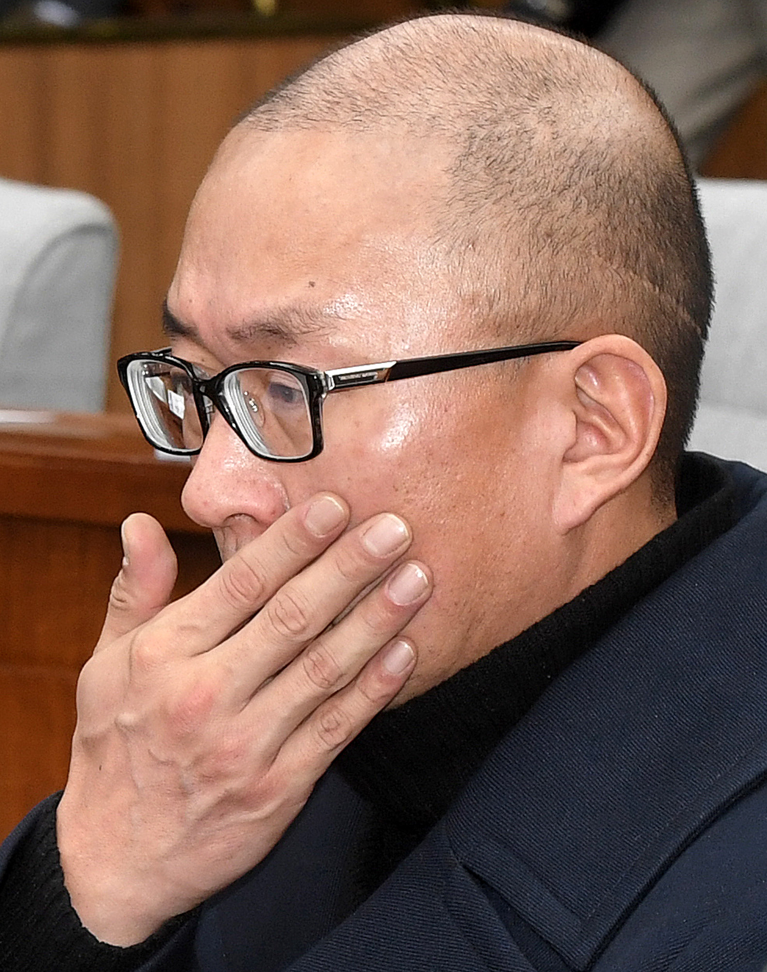 7일 오전 서울 여의도 국회에서 열린 '박근혜 정부의 최순실 등 민간인에 의한 국정농단 의혹사건 진상규명을 위한 국정조사특별위원회' 2차 청문회에서 차은택 전 창조경제추진단장이 잠시 얼굴을 만지고 있다. 161207 사진공동취재단 |