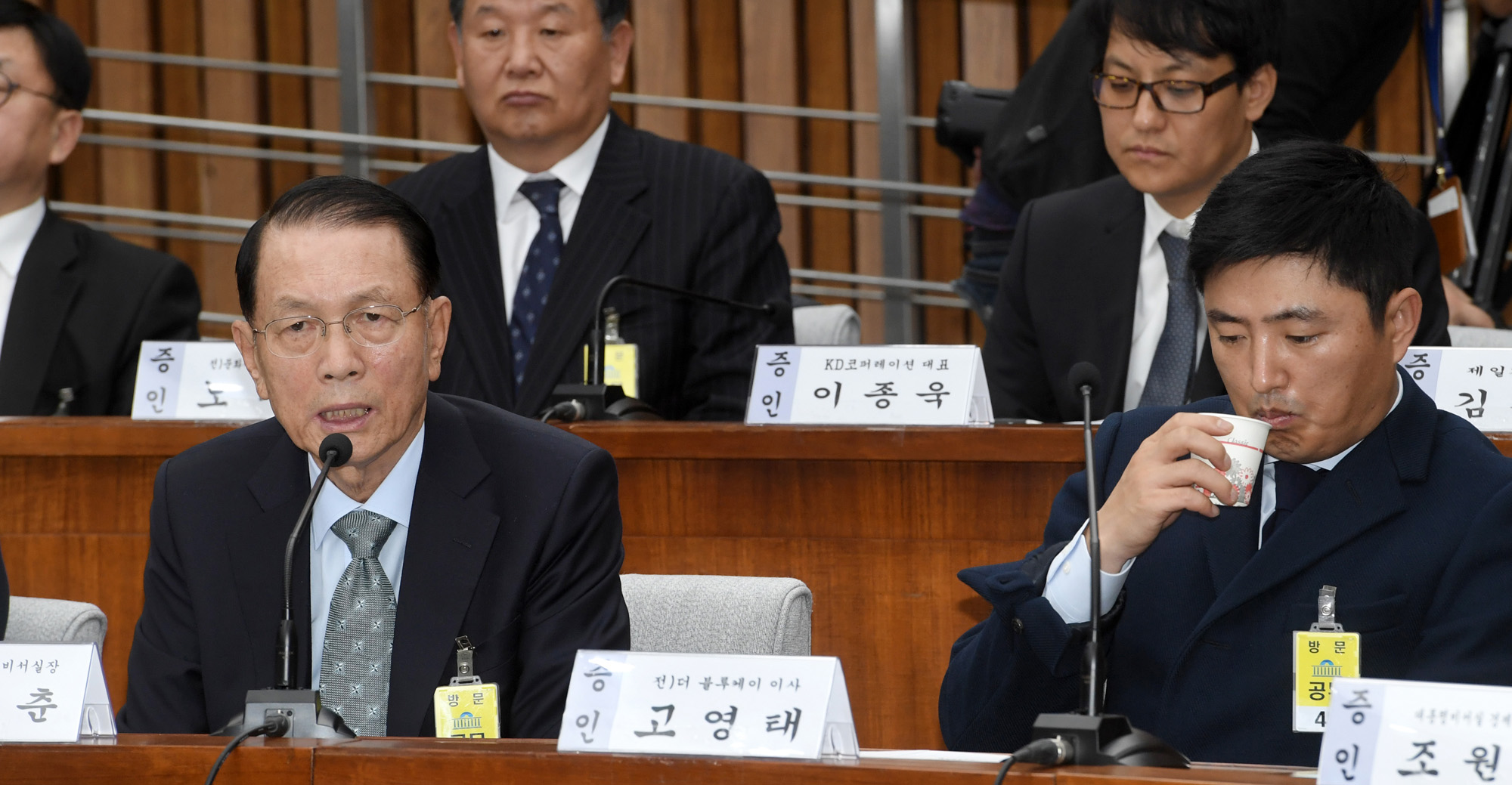 7일 오전 서울 여의도 국회에서 열린 '박근혜 정부의 최순실 등 민간인에 의한 국정농단 의혹사건 진상규명을 위한 국정조사특별위원회' 2차 청문회에서 김기춘 전 청와대 비서실장(왼쪽)이 의원 질의에 답변하던 중 고영태 전 더블루K 이사가 물을 마시고 있다. 161207 사진공동취재단 |