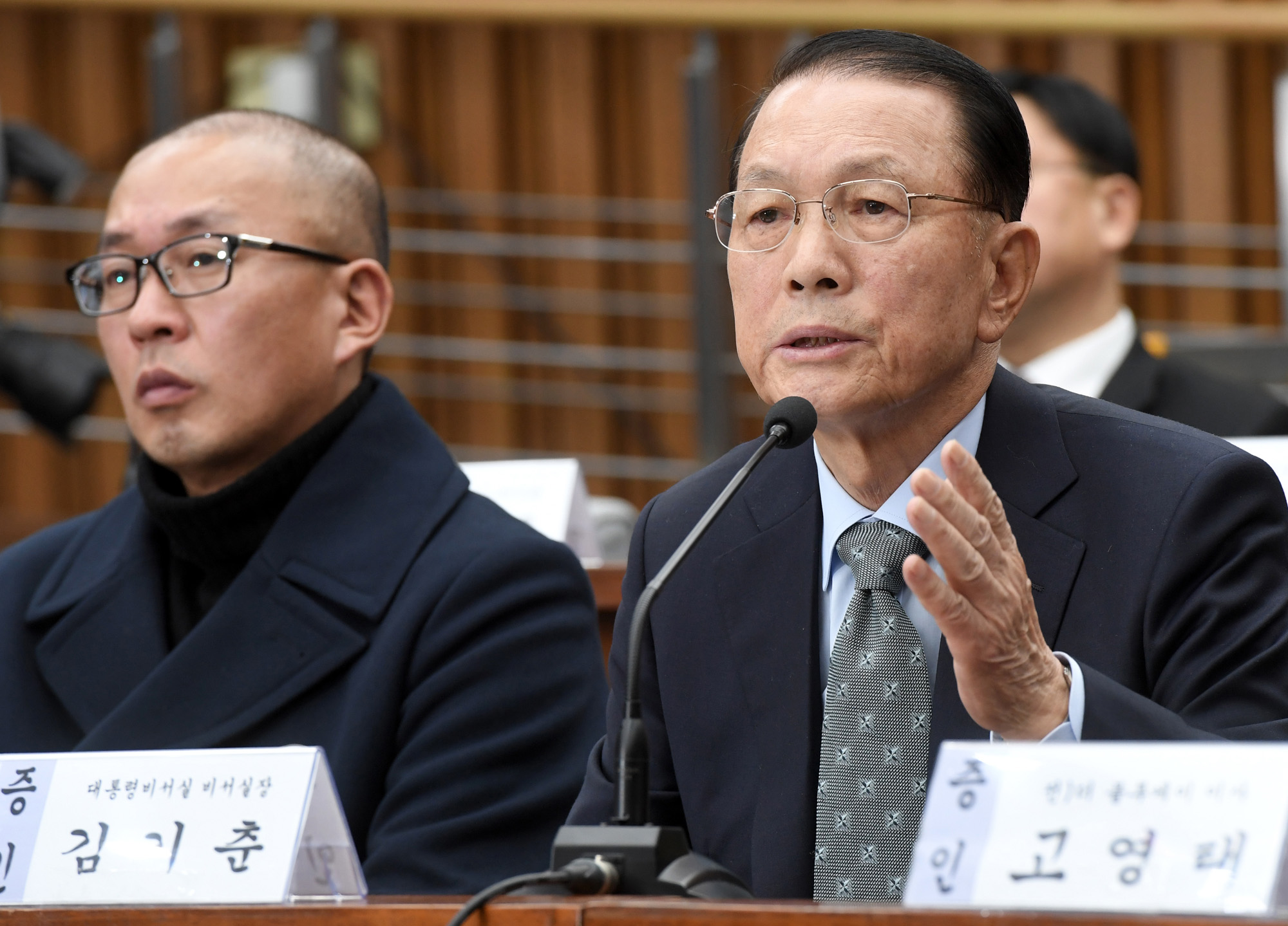 7일 오전 서울 여의도 국회에서 열린 '박근혜 정부의 최순실 등 민간인에 의한 국정농단 의혹사건 진상규명을 위한 국정조사특별위원회' 2차 청문회에서 김기춘 전 청와대 비서실장(오른쪽)이 의원 질의에 답변하고 있다. 161207 사진공동취재단 |
