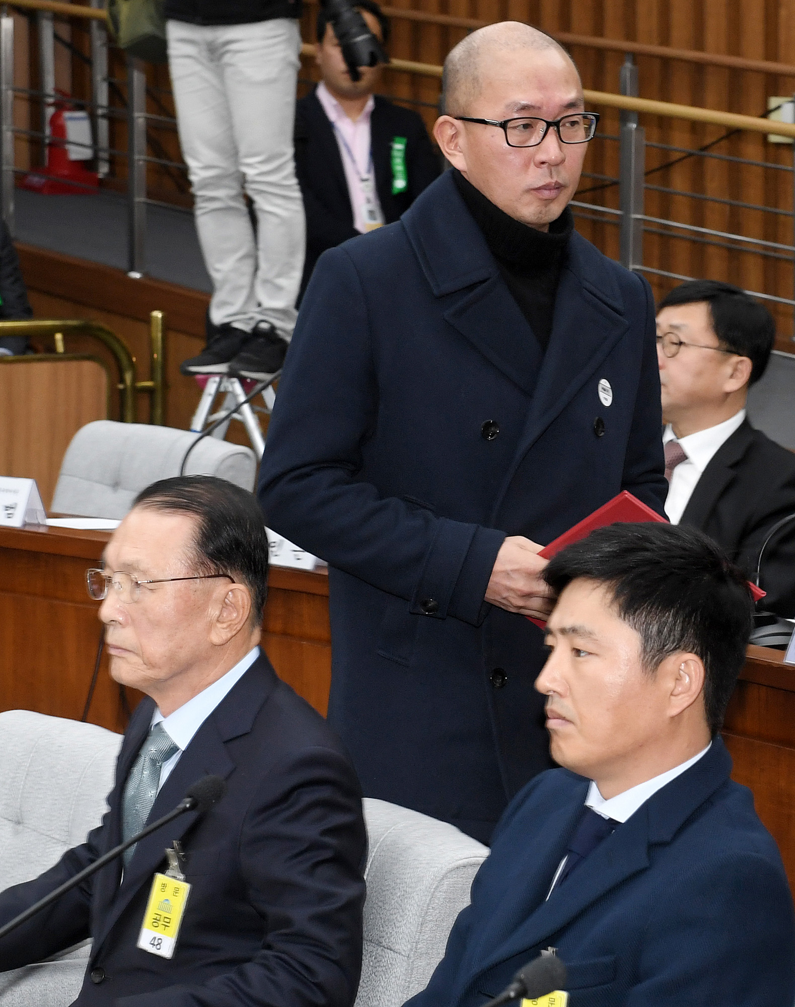 7일 오전 서울 여의도 국회에서 열린 '박근혜 정부의 최순실 등 민간인에 의한 국정농단 의혹사건 진상규명을 위한 국정조사특별위원회' 2차 청문회에서 차은택 전 창조경제추진단장(가운데)이 대표로 증인 선서를 하기 위해 발언대로 향하고 있다. (왼쪽부터) 김기춘 전 청와대 비서실장, 차 전 단장, 고영태 전 더블루K 이사. 161207 사진공동취재단 |