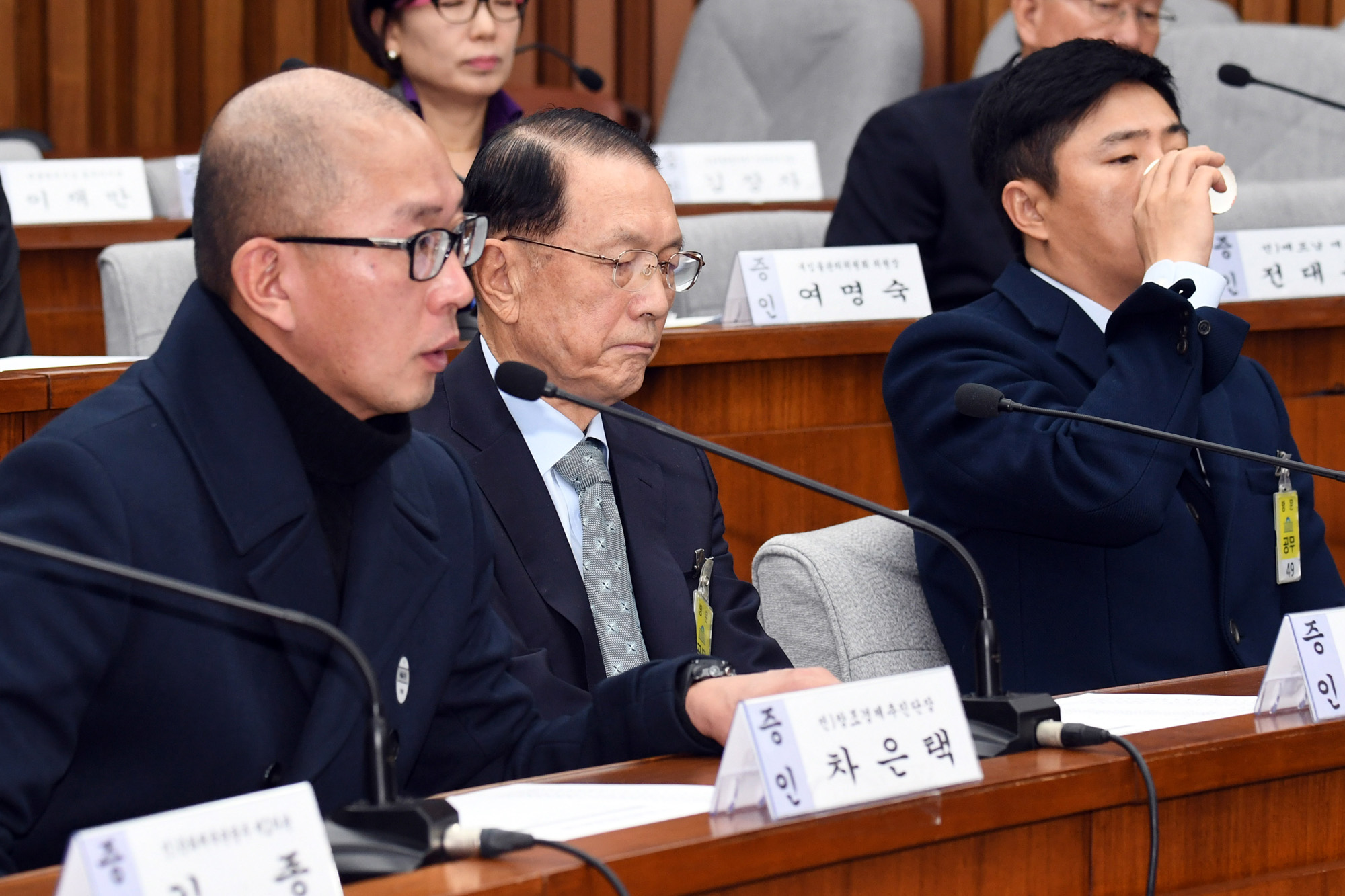 7일 오전 서울 여의도 국회에서 열린 '박근혜 정부의 최순실 등 민간인에 의한 국정농단 의혹사건 진상규명을 위한 국정조사특별위원회' 2차 청문회에서 의원들의 질의를 받는 차은택 전 창조경제추진단장 옆으로 굳은 표정의 김기춘 전 대통령비서실장과 물을 마시고 있는 고영태 전 더 블루케이 이사가 나란히 앉아있다. 161207 사진공동취재단 |