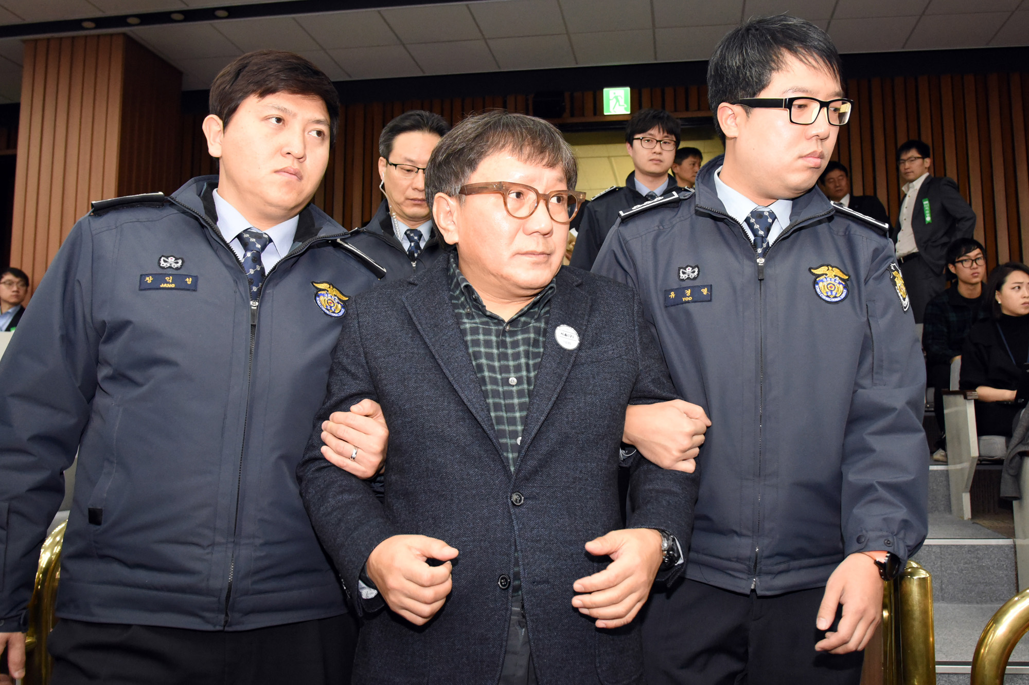 7일 오전 서울 여의도 국회에서 열린 '박근혜 정부의 최순실 등 민간인에 의한 국정농단 의혹사건 진상규명을 위한 국정조사특별위원회' 2차 청문회에 구속된 송성각 전 콘텐츠진흥원 원장이 교도관들과 청문회장으로 들어서고 있다. 161207 사진공동취재단 |