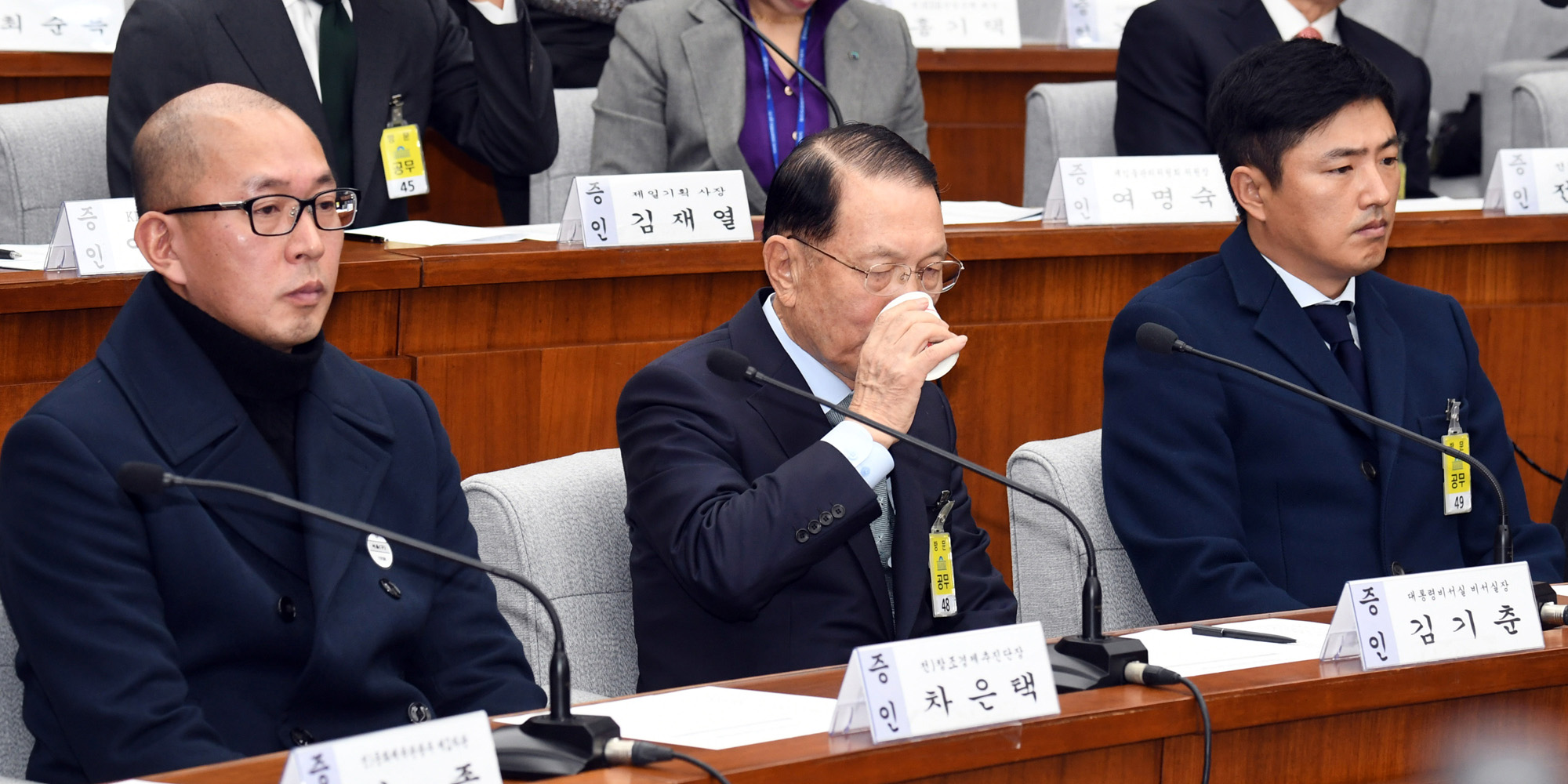 7일 오전 서울 여의도 국회에서 열린 '박근혜 정부의 최순실 등 민간인에 의한 국정농단 의혹사건 진상규명을 위한 국정조사특별위원회' 2차 청문회에 증인으로 출석한 김기춘 전 대통령비서실장이 차은택 전 창조경제추진단장(좌측)과 고영태 전 더 블루케이 이사(우측) 사이에서 물을 마시고 있다. 161207 사진공동취재단 |