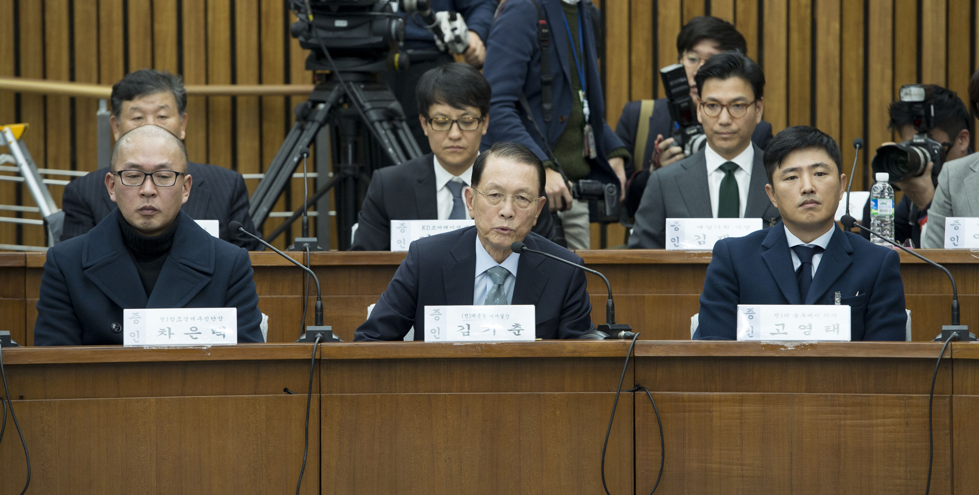 김기춘 전 청와대 비서실장(왼쪽 두번째)이 7일 서울 여의도 국회에서 열린 박근혜 정부의 최순실 등 민간인에 의한 국정농단 의혹사건 진상규명을 위한 국정조사특별위원회 청문회에서 의원들의 질의에 답하고 있다. 사진 왼쪽부터 차은택 전 창조경제추진단장, 김 전 실장, 고영태 전 더블루K 이사. 유동일기자 eddieyou@ 161207 사진공동취재단 |