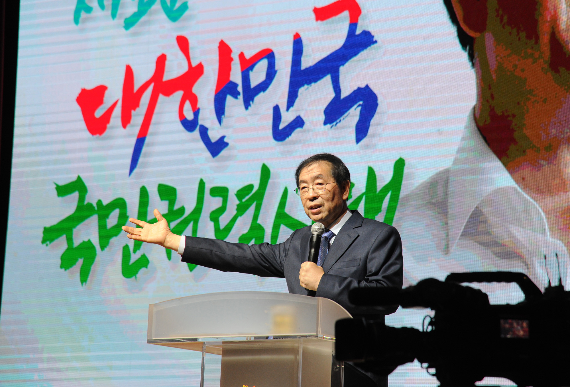 2일 오후 경기도 수원시 수원시청 대강당에서 열린 제78회 수원 포럼에서 박원순 서울시장과 염태영 수원시장이 토크 콘서트를 하고 있다. 서울시 제공