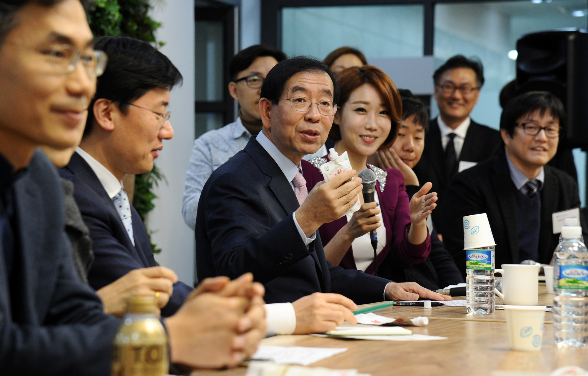 박원순 서울시장이 7일 서울먹거리창업센터 개소식을 마친 후 입주기업 관계자와 대화를 나누고 있다. 서울시 제공