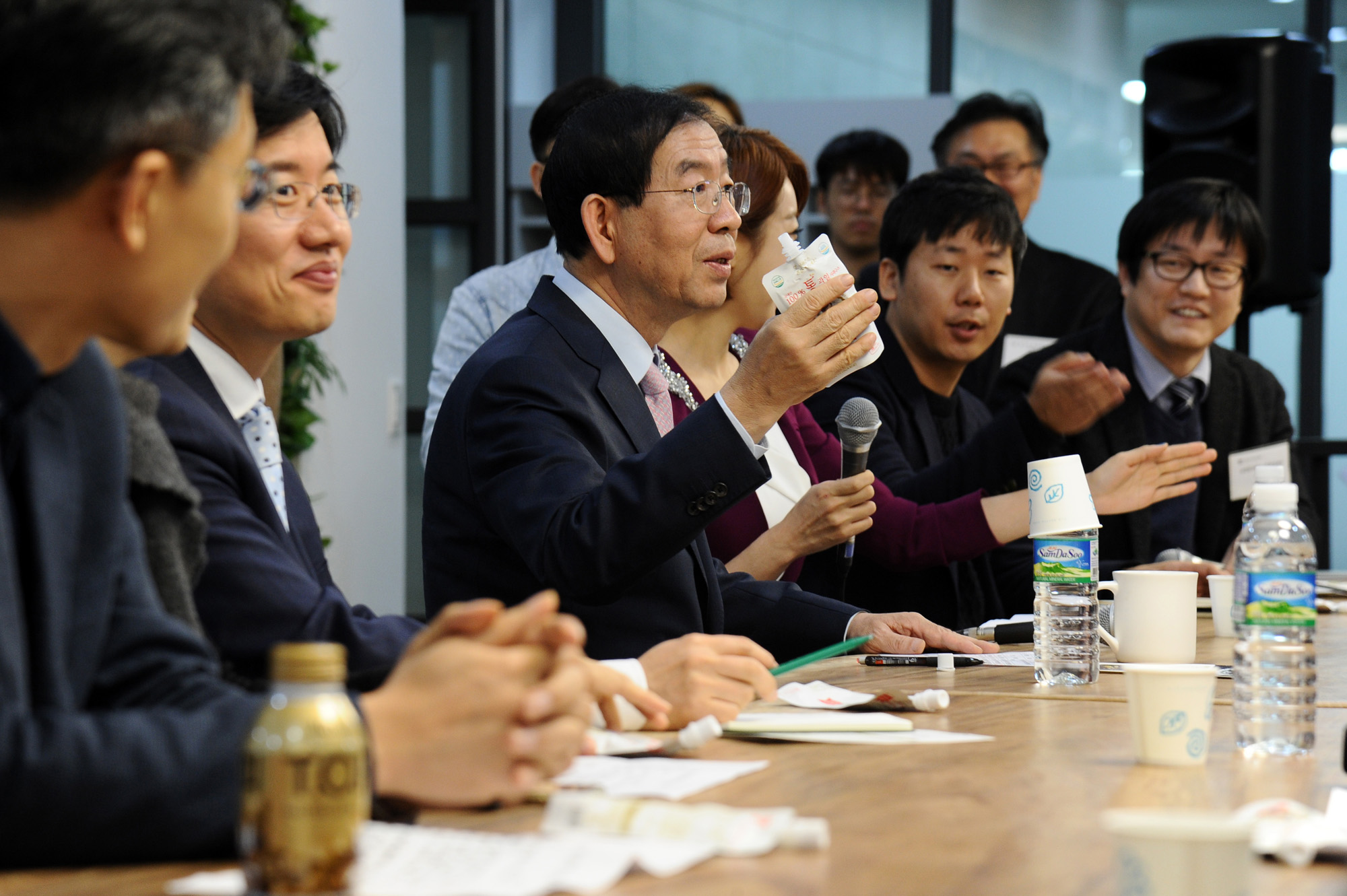 박원순 서울시장이 7일 서울먹거리창업센터 개소식을 마친 후 입주기업 관계자와 대화를 나누고 있다. 서울시 제공