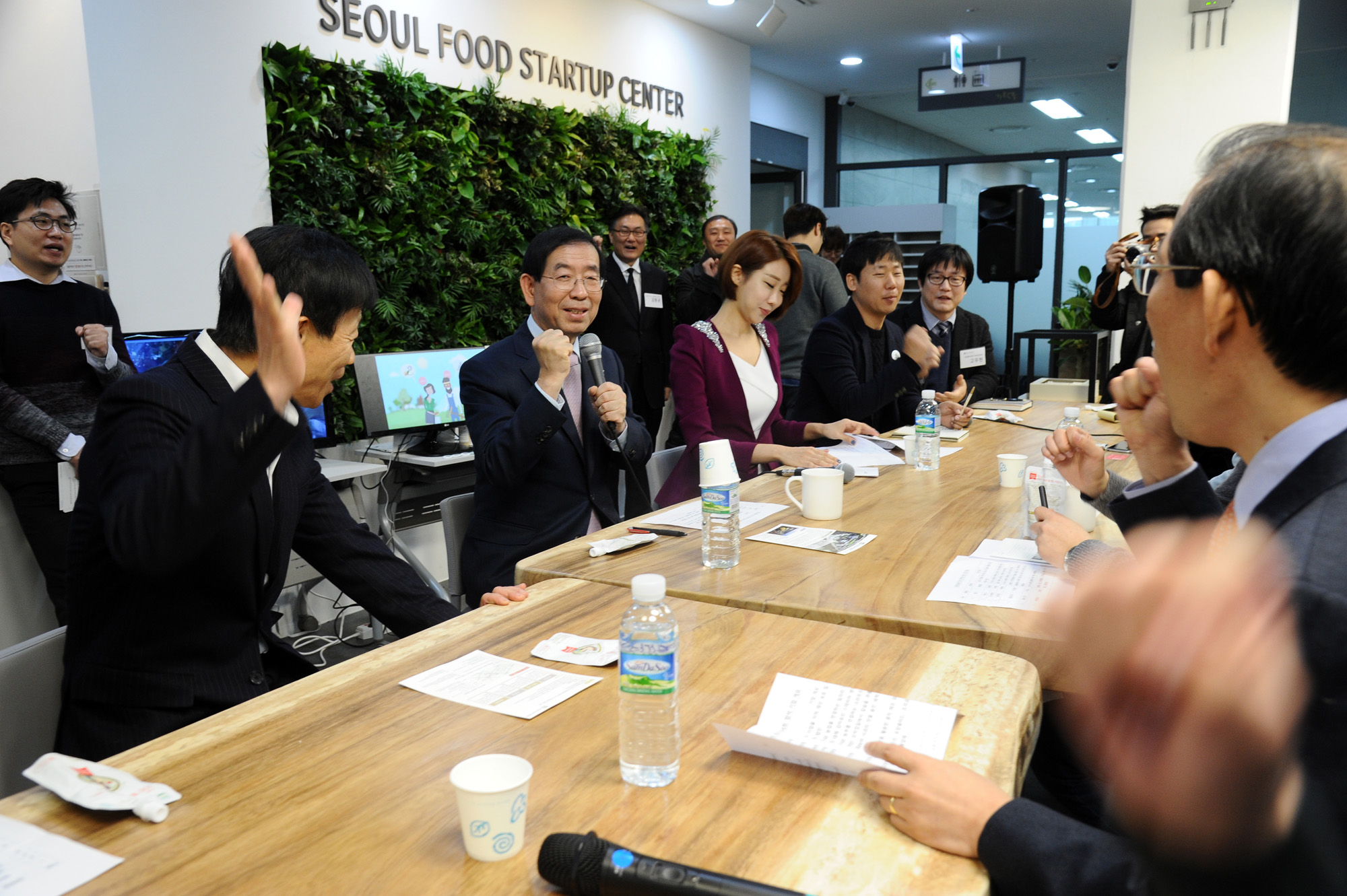 박원순 서울시장이 7일 서울먹거리창업센터 개소식을 마친 후 입주기업 관계자와 대화를 나누고 있다. 서울시 제공