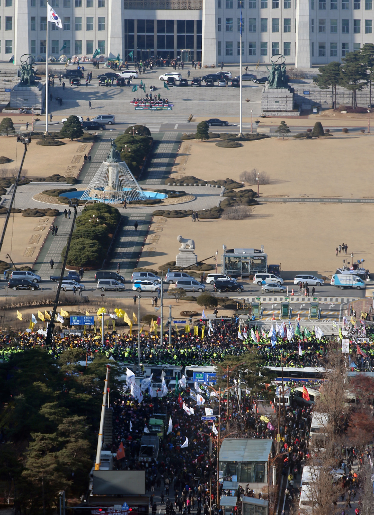 박근혜 대통령 탄핵소추안 표결일인 9일 오후 서울 영등포구 여의도 국회의사당 앞으로 경찰과 집회 참가자들이 대치하고 있다. [2016.12.09 뉴스웨이 이수길]