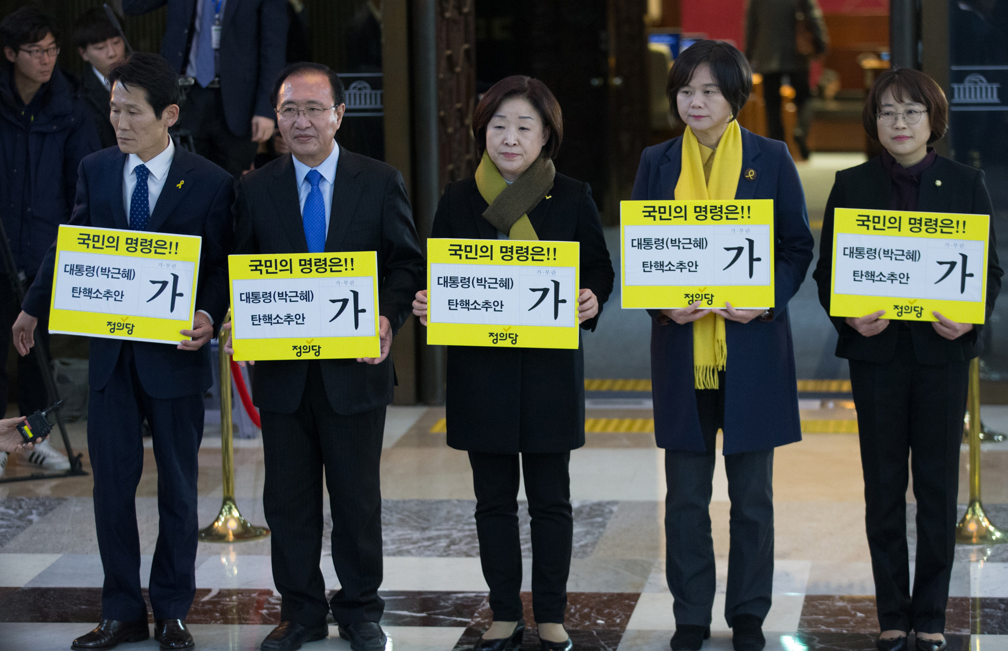 (서울=포커스뉴스) 박근혜 대통령 탄핵안 표결을 앞둔 9일 오후 서울 여의도 국회 본회의장 앞에서 심상정 정의당 상임대표 등 의원들이 탄핵 가결을 호소하고 있다.