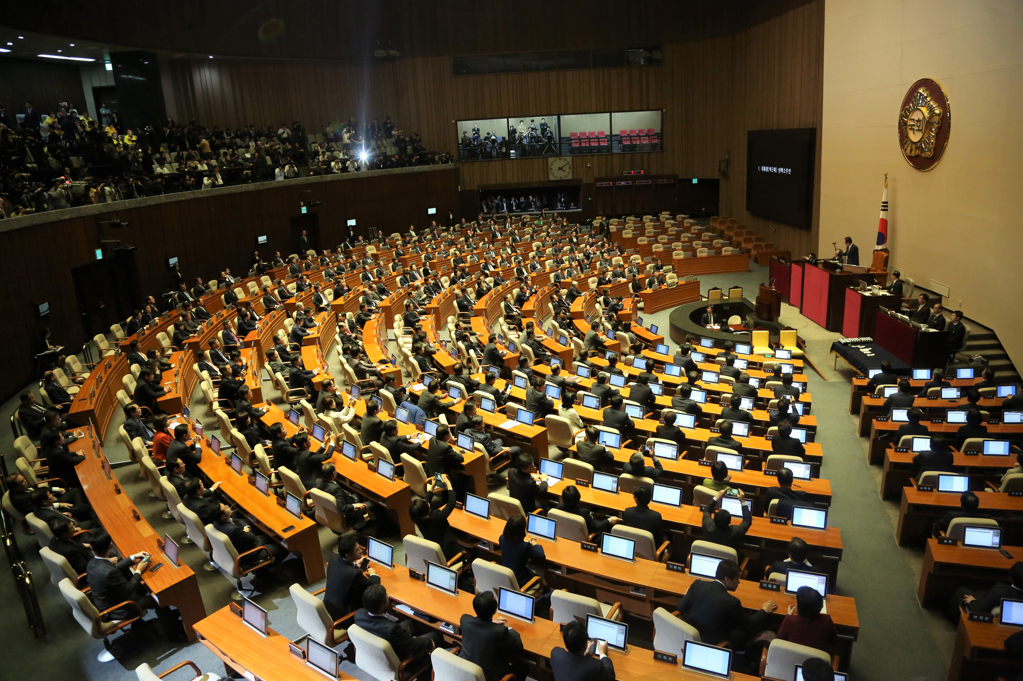 정세균 국회의장이 9일 오후 국회에서 열린 본회의에서 '대통령(박근혜) 탄핵소추안' 가결을 선포하고 있다.