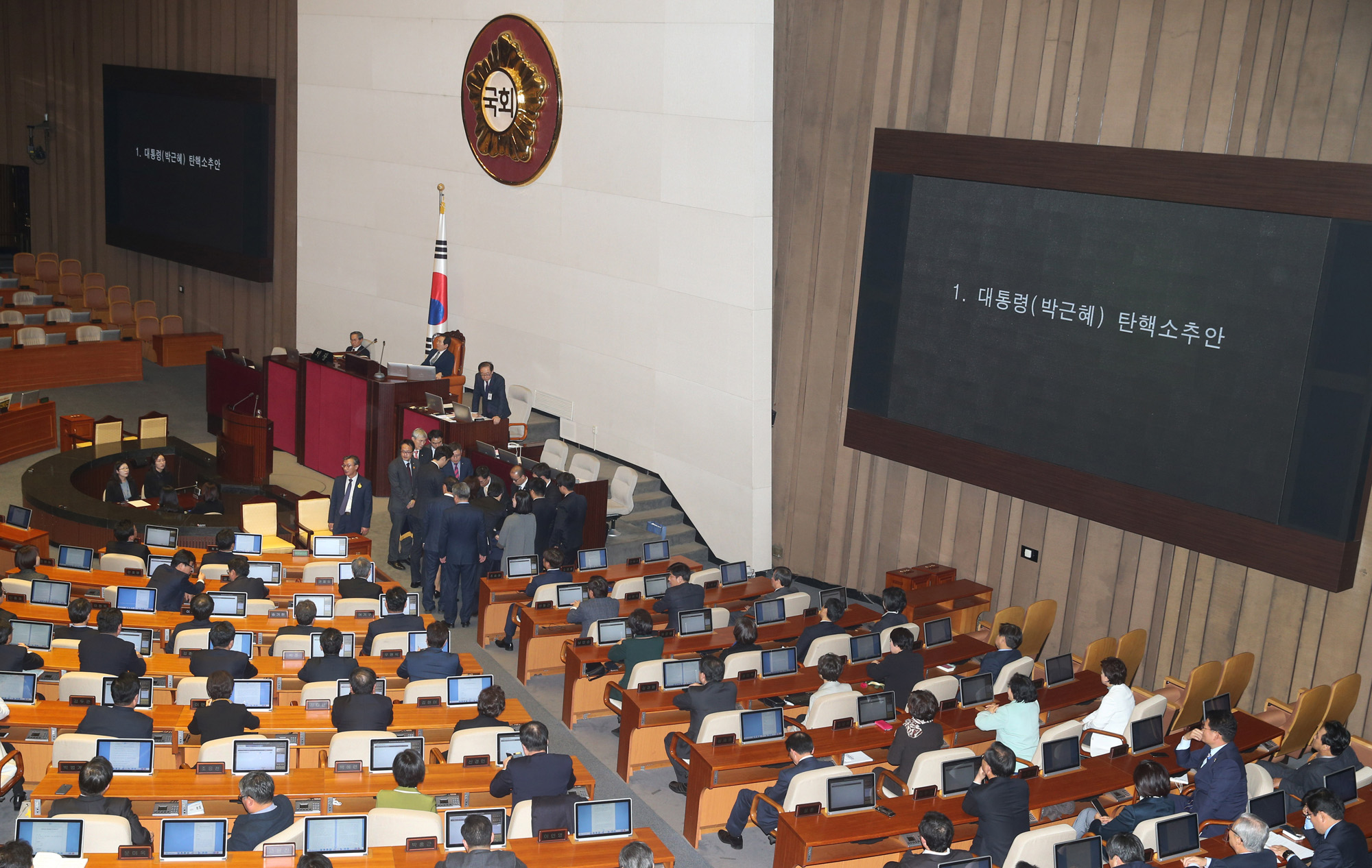 박근혜 대통령 탄핵소추안이 가결된 9일 오후 서울 여의도 국회에서 열린 제18차 본회의에서 탄핵안 투표를 마친 뒤 개표하고 있다. 2016.12.09 머니투데이 이동훈