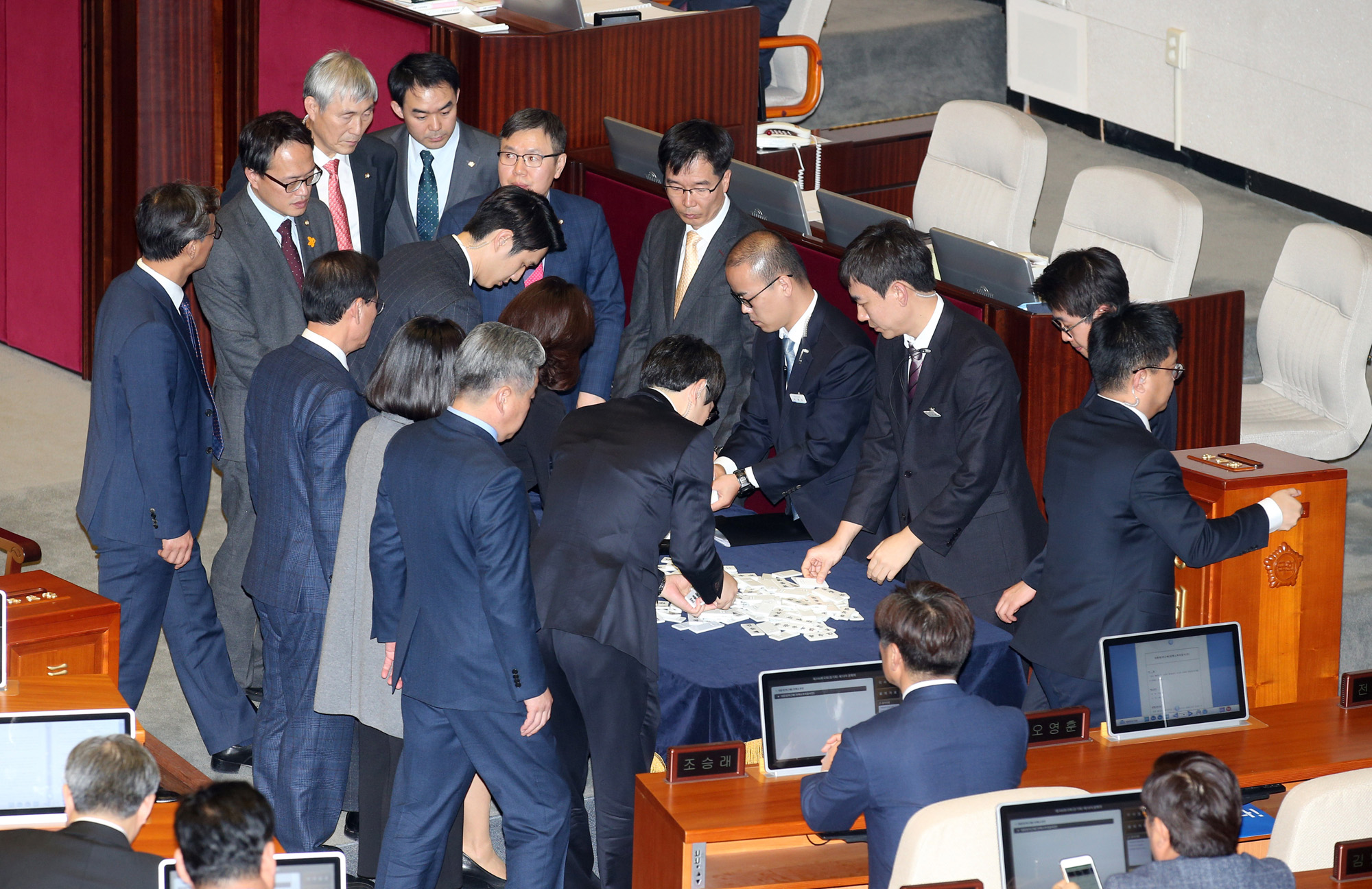 박근혜 대통령 탄핵소추안이 가결된 9일 오후 서울 여의도 국회에서 열린 제18차 본회의에서 탄핵안 투표를 마친 뒤 개표하고 있다. 2016.12.09 머니투데이 이동훈