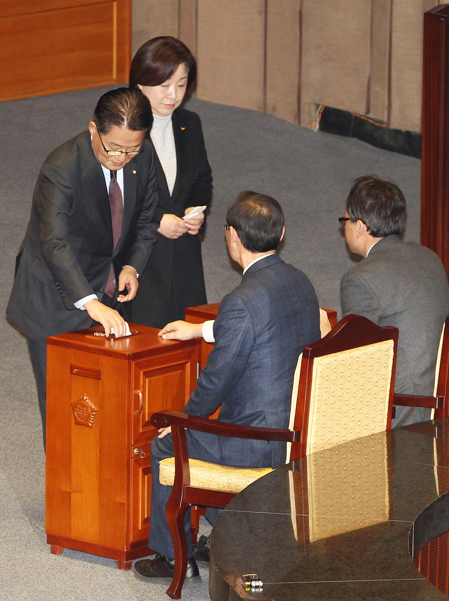 박지원 국민의당 원내대표와 심상정 정의당 대표가 9일 국회 본회의장에서 열린 박근혜 대통령 탄핵안에 투표하고 있다.