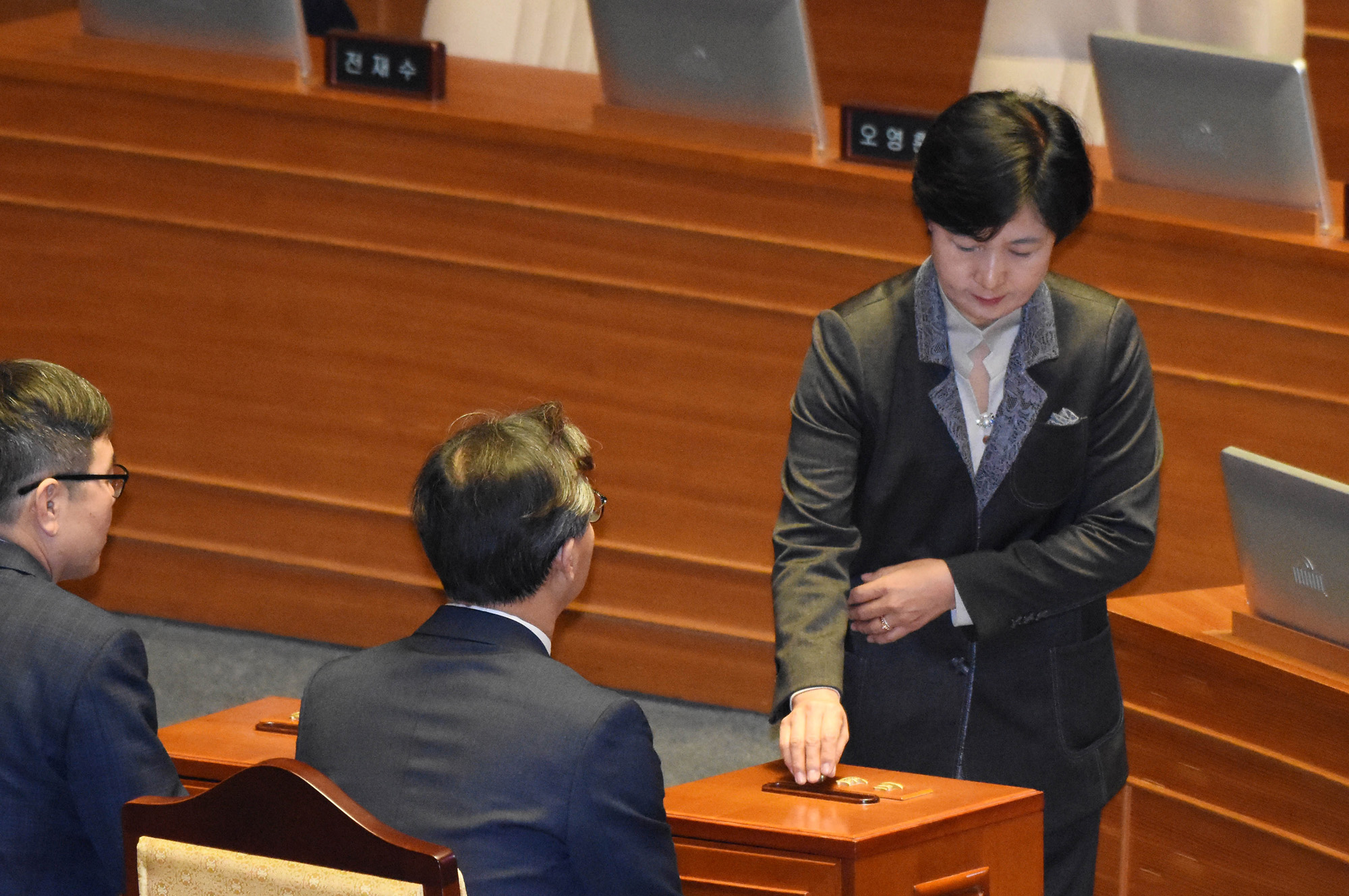추미애 대표가 9일 오후 서울 여의도 국회 본회장에서 야 3당이 발의한 박근혜 대통령 탄핵소추안에 대한 투표 후 투표함에 투표 용지를 넣고 있다.