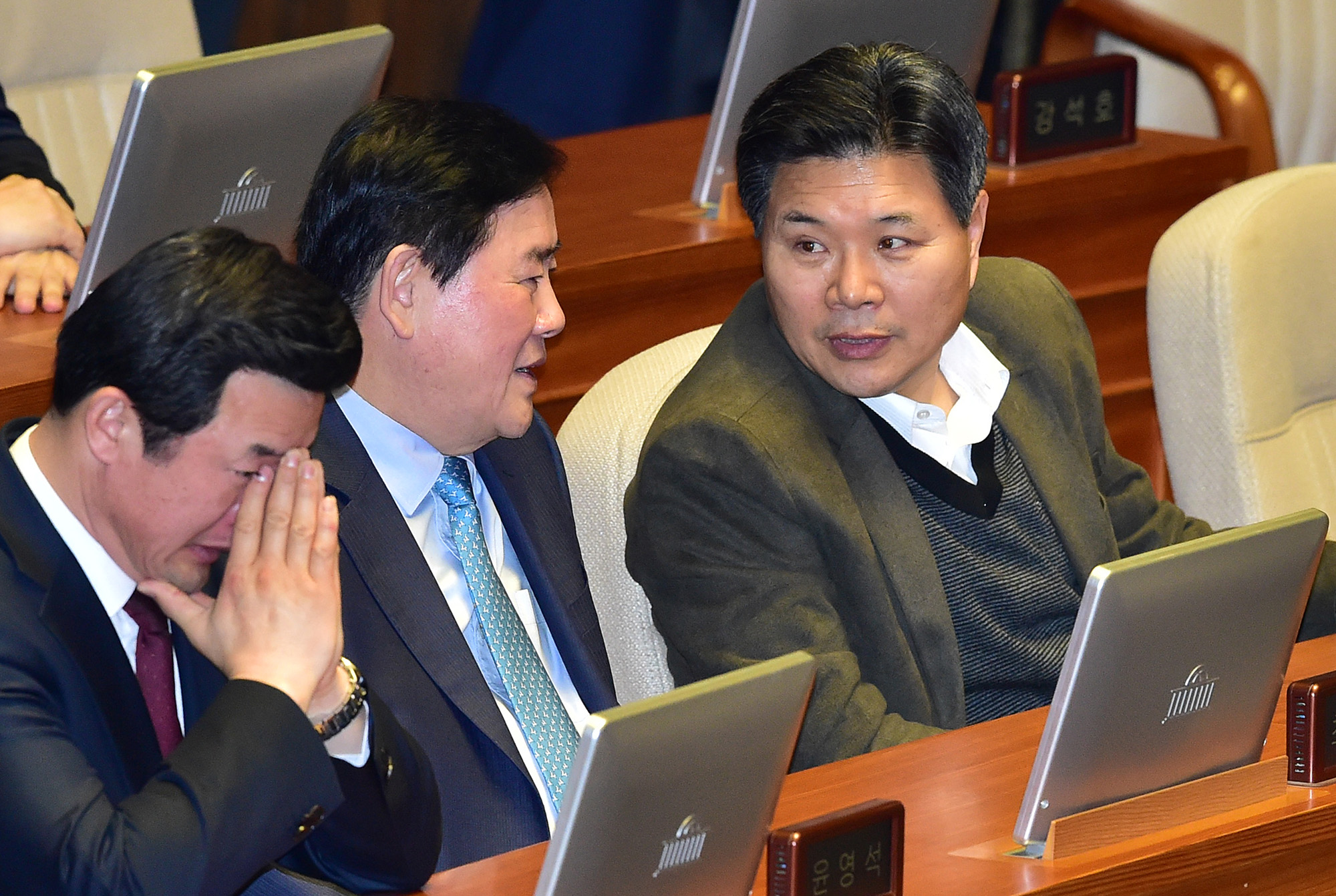 아시아투데이 이병화 기자 = 최경환-홍문종 새누리당 의원이 9일 국회에서 열린 박근혜 대통령 탄핵소추안 표결을 위한 본회의에서 대화를 나누고 있다. /이병화 기자photolbh@