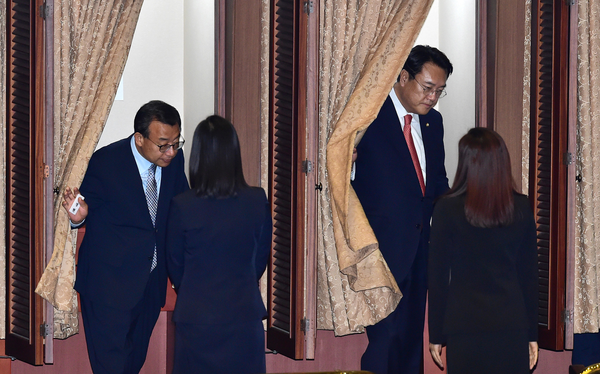 아시아투데이 이병화 기자 = 이정현 새누리당 대표와 정진석 원내대표가 9일 국회에서 열린 박근혜 대통령 탄핵소추안 표결을 위한 본회의에서 투표를 마친 뒤 투표소를 나서고 있다. /이병화 기자photolbh@