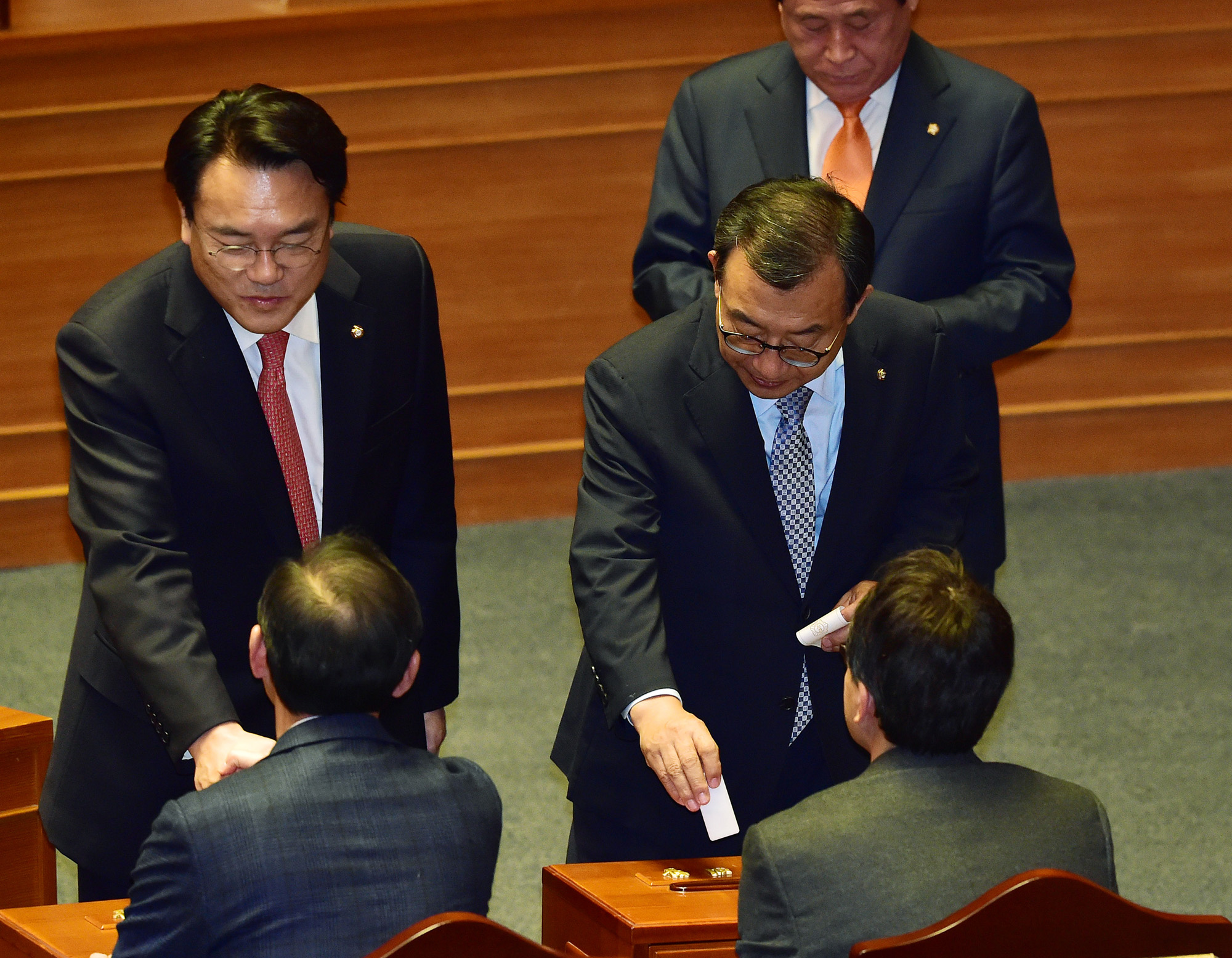 아시아투데이 이병화 기자 = 이정현 새누리당 대표와 정진석 원내대표가 9일 국회에서 열린 박근혜 대통령 탄핵소추안 표결을 위한 본회의에서 투표를 하고 있다. /이병화 기자photolbh@