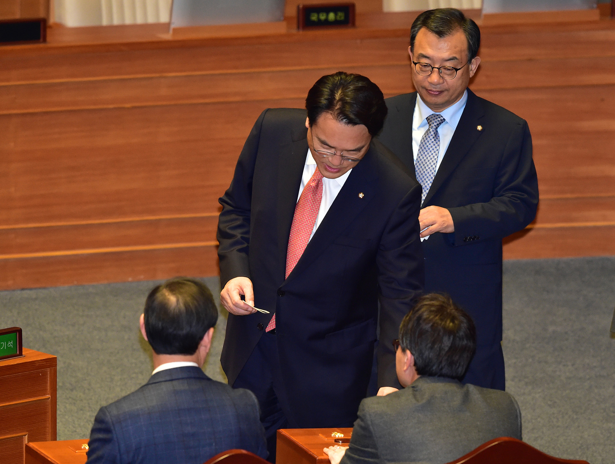 아시아투데이 이병화 기자 = 이정현 새누리당 대표와 정진석 원내대표가 9일 국회에서 열린 박근혜 대통령 탄핵소추안 표결을 위한 본회의에서 투표를 하고 있다. /이병화 기자photolbh@