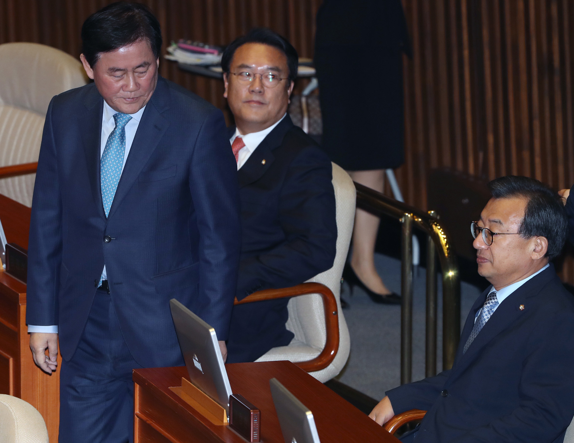 박근혜 대통령 탄핵소추안 표결이 예정된 9일 국회 본회의장에 새누리당 최경환 의원이 입장하고 있다. 오른쪽은 이정현 대표와 정진석 원내대표.