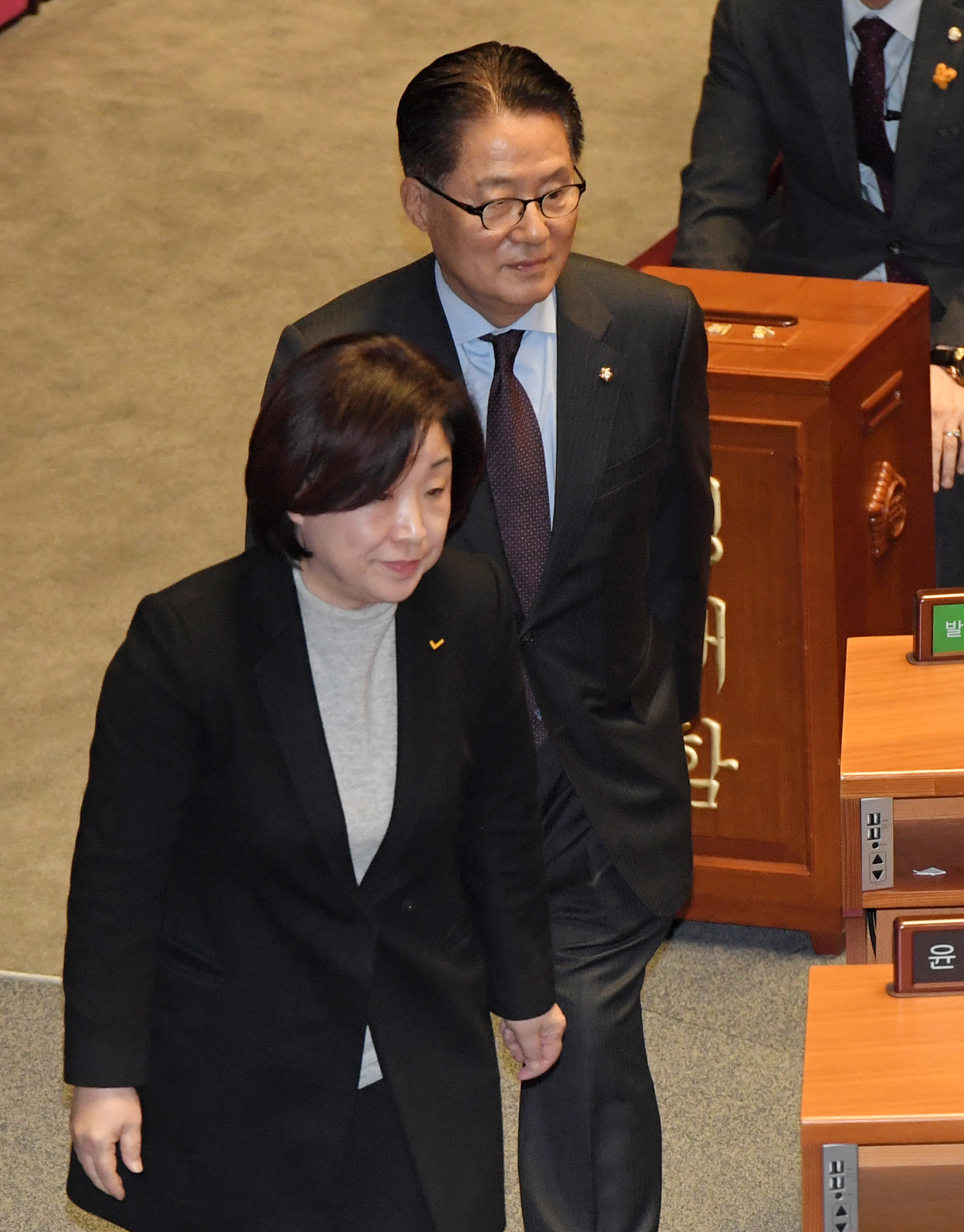 정의당 심상정 대표(왼쪽)와 국민의당 박지원 원내대표가 9일 오후 서울 여의도 국회 본회의장에서 박근혜 대통령 탄핵소추안에 대한 무기명 투표를 마친 뒤 의석으로 돌아가고 있다.