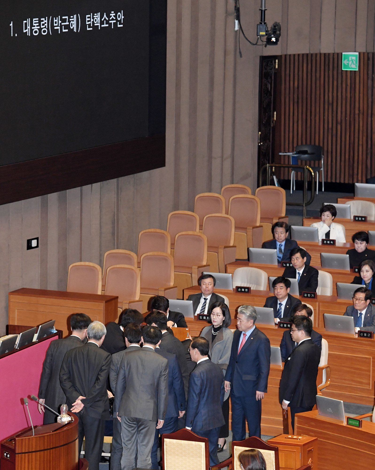 9일 오후 서울 여의도 국회 본회의장에서 박근혜 대통령 탄핵소추안에 대한 무기명투표가 끝난 뒤 개표위원들이 개표를 하고 있다.