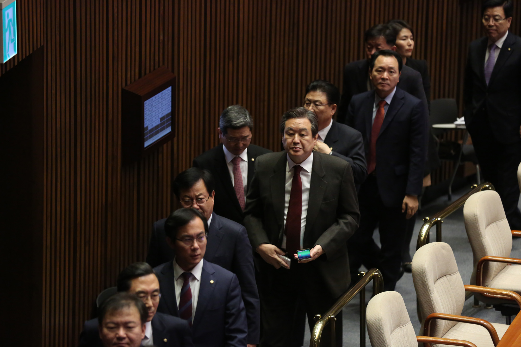 김무성 새누리당 전 대표가 9일 오후 국회 본회의장에서 열린 박근혜 대통령 탄핵소추안에 투표에 참여하고 있다.