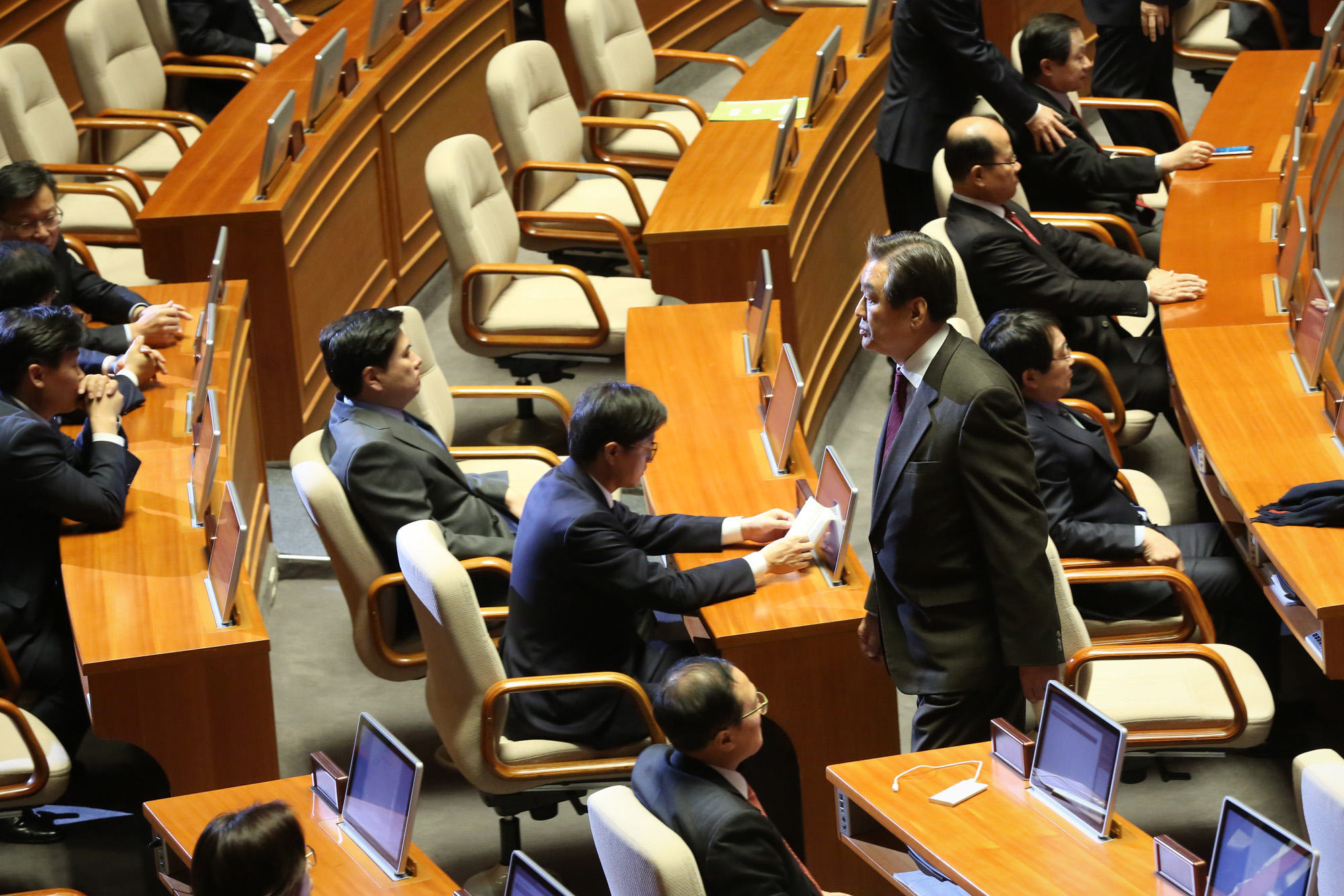 김무성 새누리당 전 대표가 9일 오후 국회 본회의장에서 열린 박근혜 대통령 탄핵소추안에 투표를 마친 후 회의장을 나가고 있다.